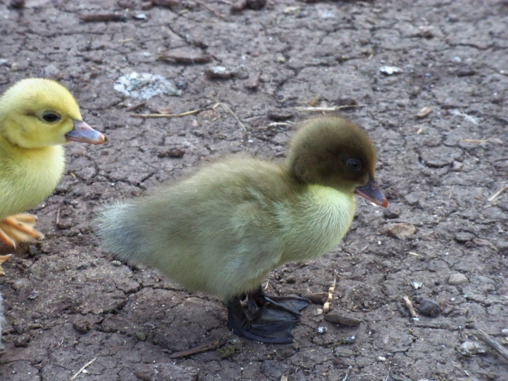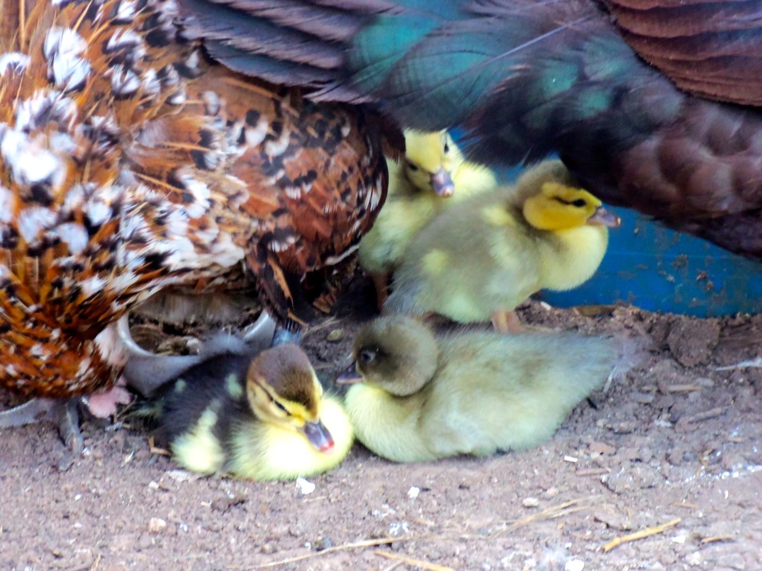 Mama Broody with her brood of ducklings. I don't know if you can tell but the duckling here is not the black and yellow like I'm used to seeing, that turn into black ducks, but this one is sort of grayish brown and yellow. There is also a black/yellow duckling in this batch and the difference is quite noticeable.