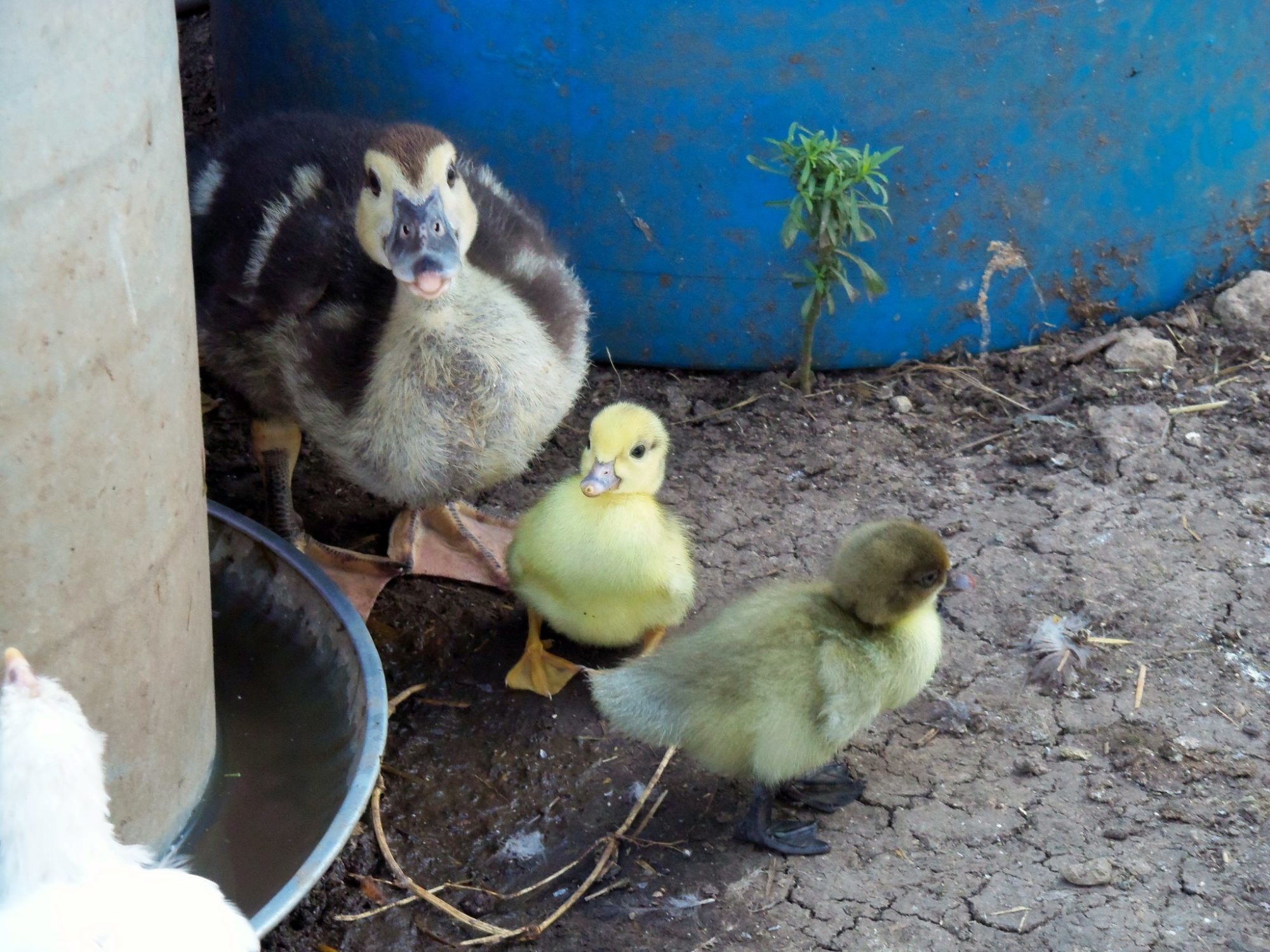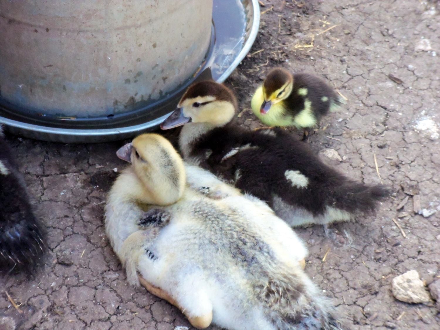 The next batch after that one is now about 3 weeks old. Here they are. They were parked at the waterer and I thought it was so sweet that the newly hatched ducklings came out from under Mama Aloha to join their older siblings. The nice thing is, the ducks all get along as one big, happy family so they don't pick on the little ones like chickens will do with new chicks. The two batches, quite different in size and development, all hung together while I took several photos.