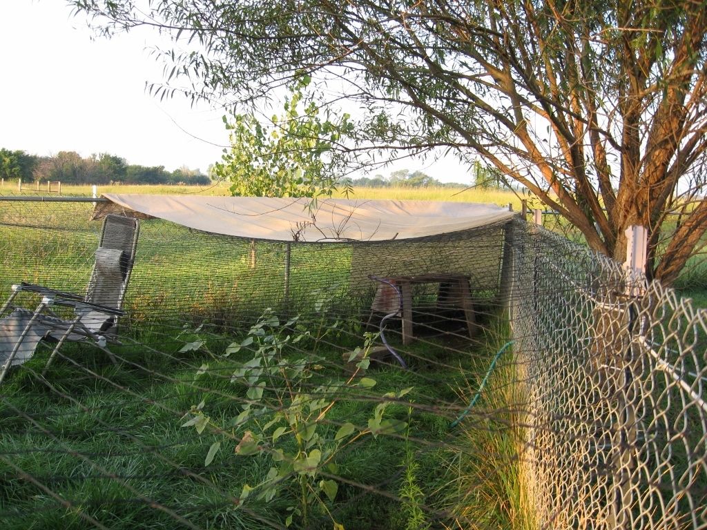 I just realized how abrupt that sounded. I used shade cloth over a corner of the run and I have a mister set up so that it sprays some of the water on the shade cloth. It acts like one of the old swamp coolers and the whole corner of the pen is 10 degrees cooler' I'll post a picture when it gets light out.