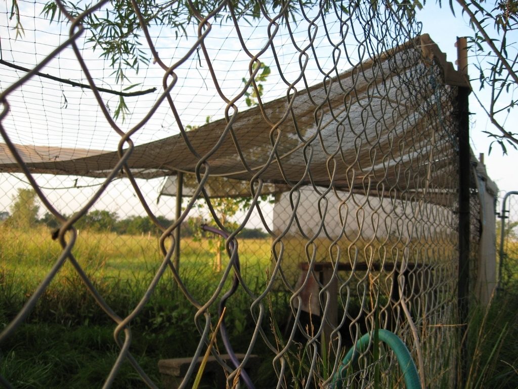 This is the people's eye view. The corner isn't a 90 degree angle. I draped the shade cloth over the bird netting and fastened it to the fencing with zip ties. this is the wide shade cloth, and there are two rows of it. You can see the cobra mister toward the front edge of the shade. The mist also drifts with the breeze so it cools other areas, too.