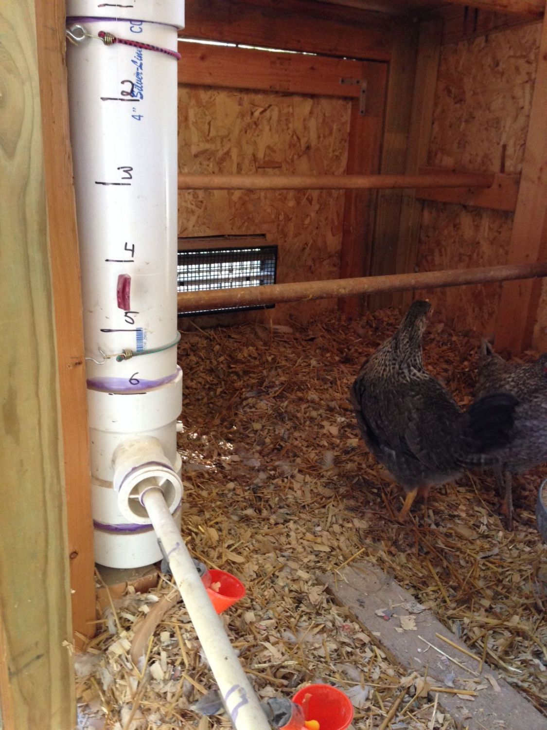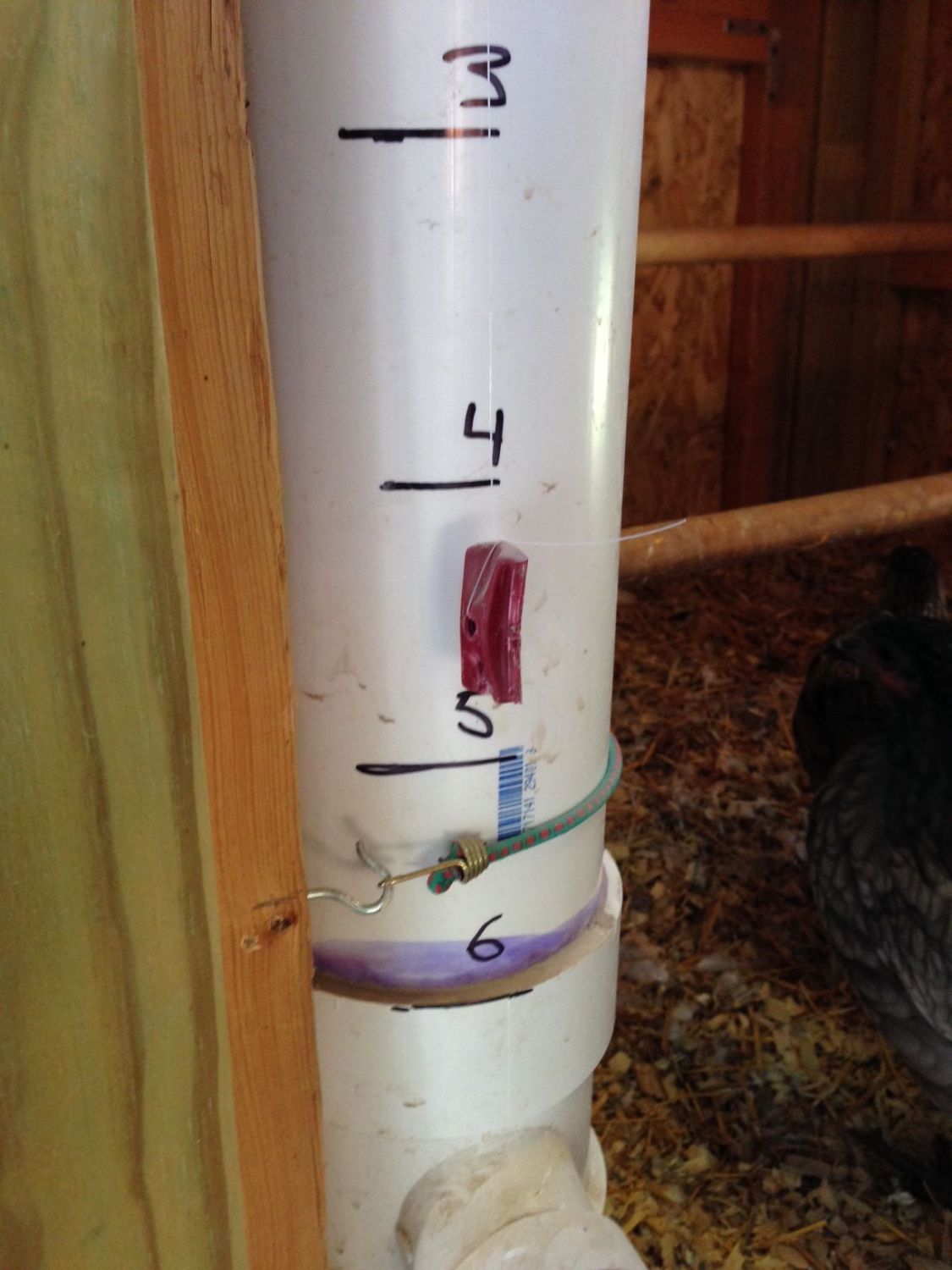 Also, going back to an old post, I'd asked for suggestions on how to monitor water usage in their summer waterer, a 4" PVC pipe with drinking cups. 22qZoo suggested a simple float and fishing line solution. I used a few fishing bobbers on the inside. Just a little piece of plastic on the outside, something the birds shouldn't be able to hurt. Here's the finished product and it works great!! Thanks for the suggestion, it's pretty straight-forward but I wasn't coming up with it.