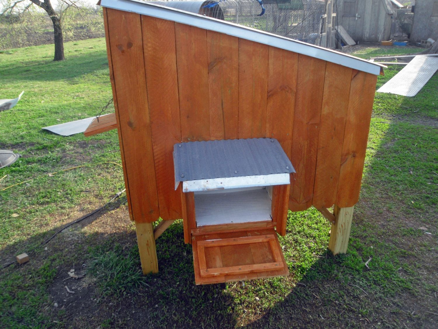 Nest box I added to the side. I did things a little different. I kept hearing about hinged roofs on nestboxes leaking. So I put flashing on before I put on the siding at the top of the nest box, and made the front open to retrieve the eggs instead.
