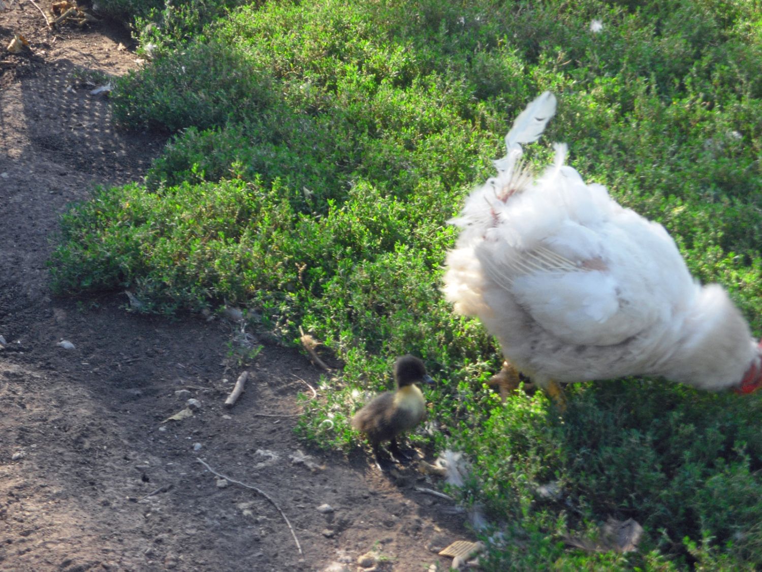 I finally took my camera out while ago. I don't know if I mentioned the hen that was sitting on duck eggs. Here she is with her two day old offspring. So far so good. I'm afraid she won't take it to the water though to clean his beak out.