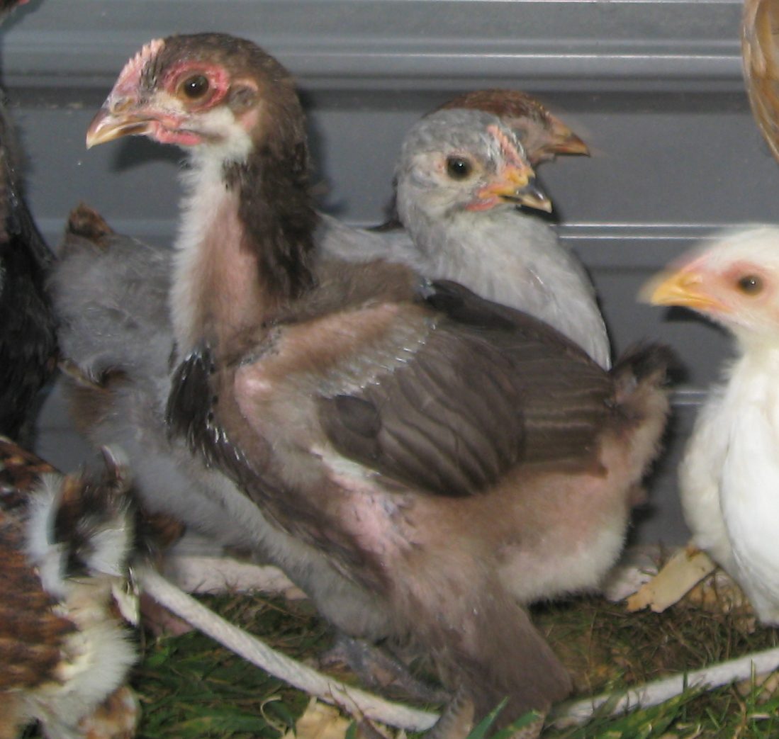 This is the one in the rear in the next picture. I wanted a feather shot. This is also the best head shot of the single lavender that hatched (4 days ahead of the others) - again small comb and round body, hoping pullet.
