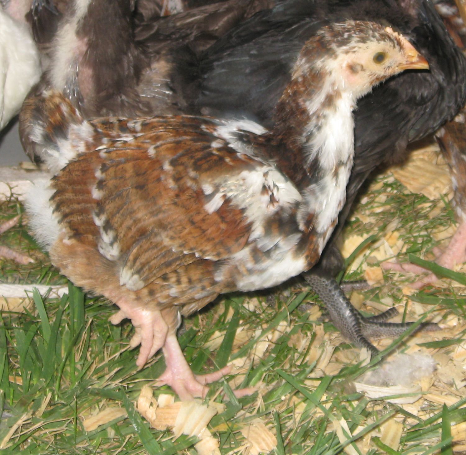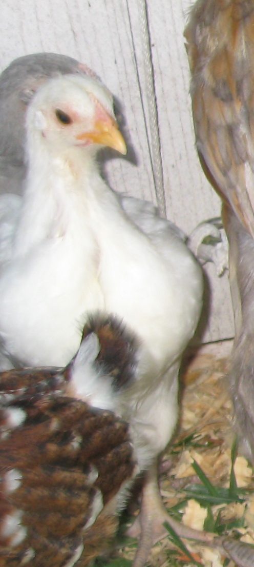 The jubilee in this picture looks female from her stance. I'm guessing the white is female too as in the whites they seem to develop the comb a little earlier than other colors. The white orp in the preceeding picture is the only white to hatch.