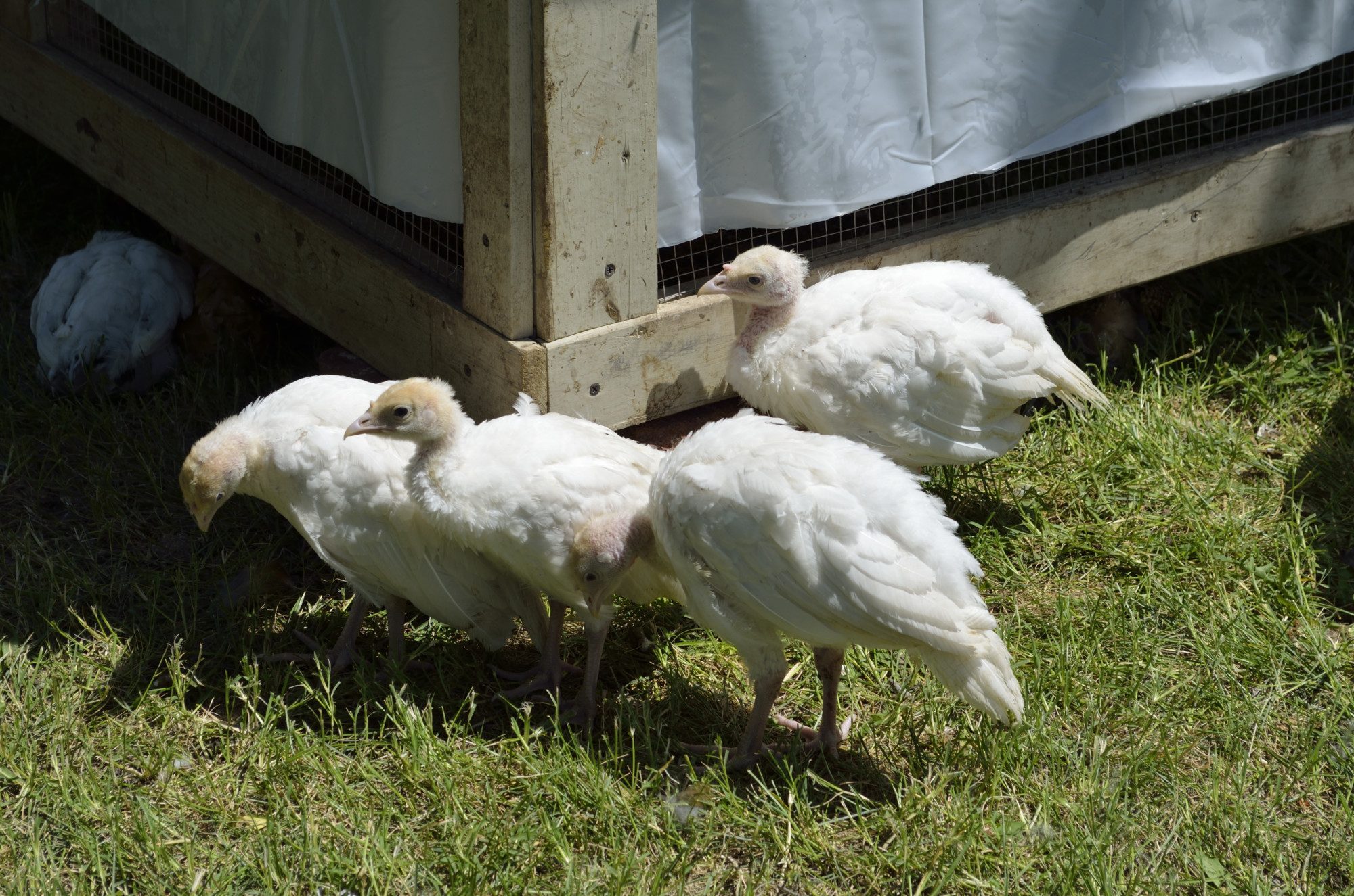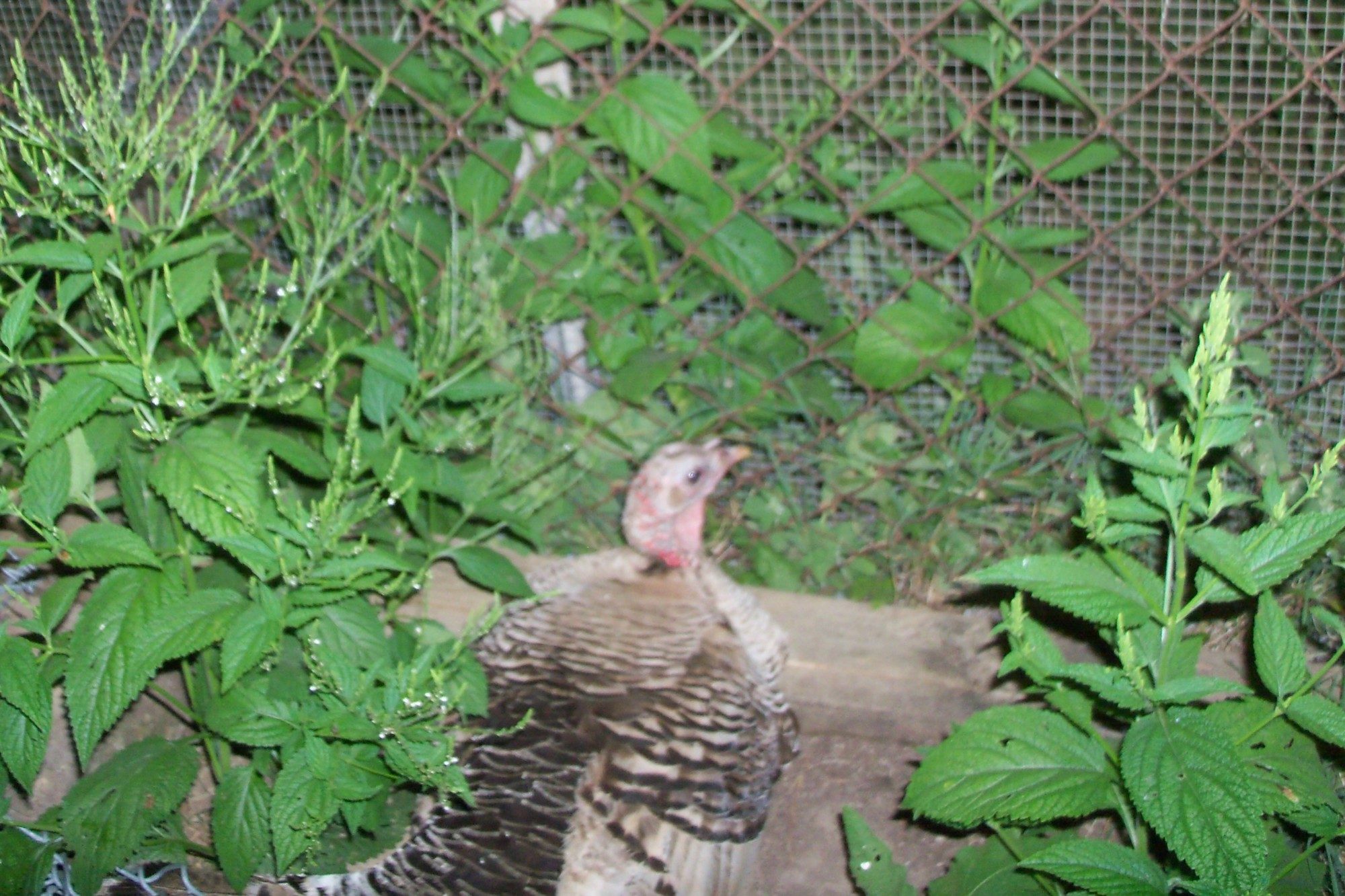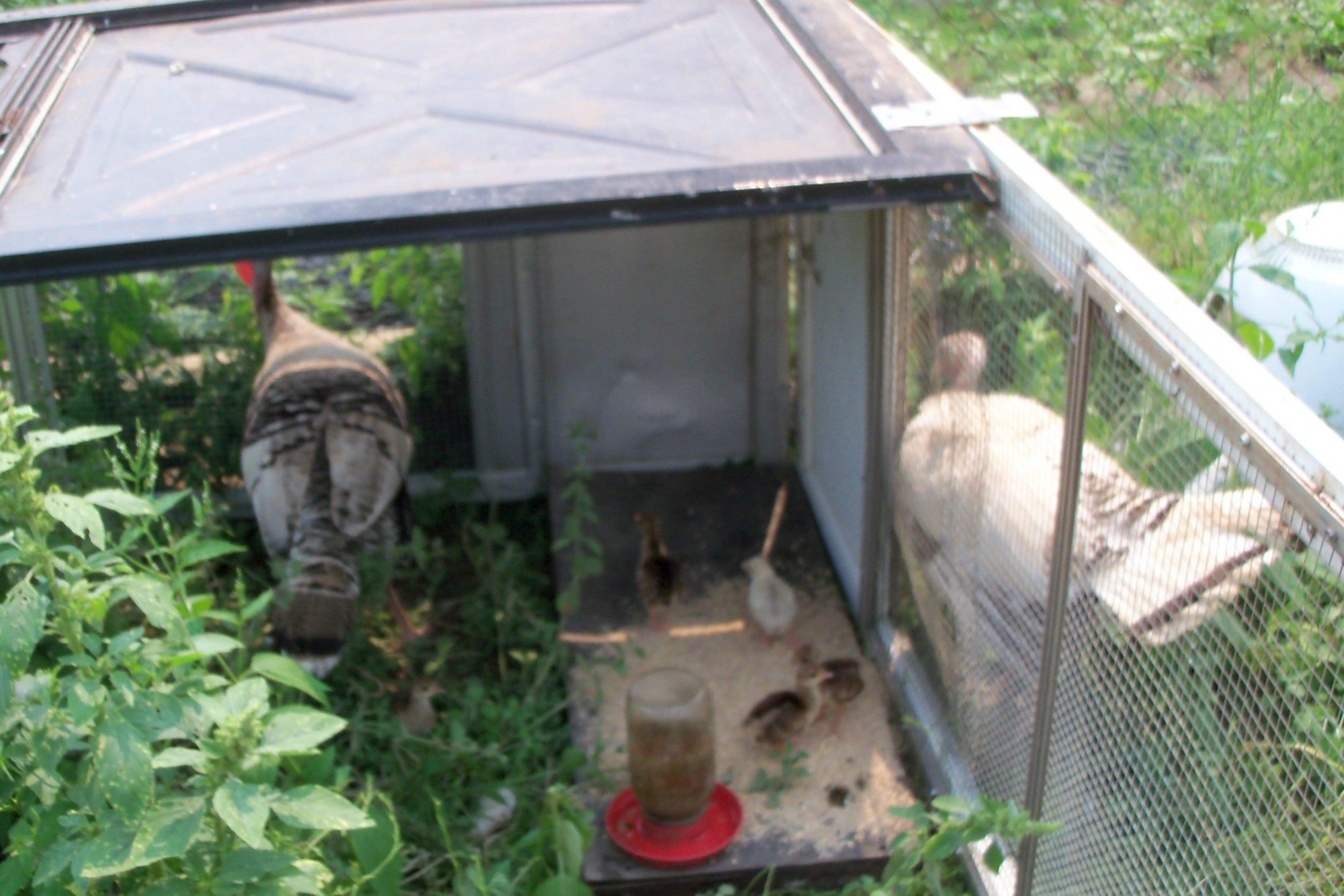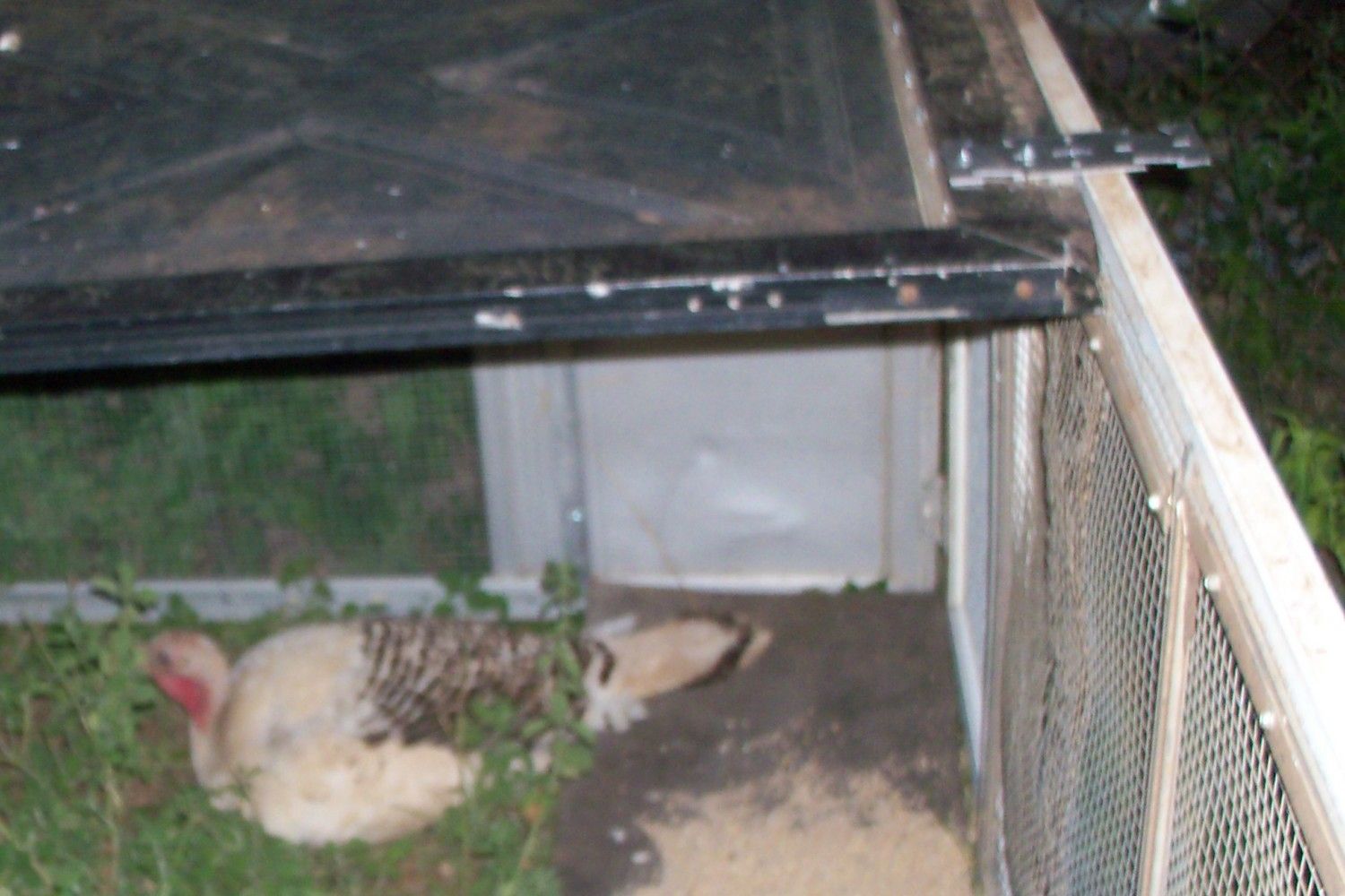 I have two turkey hens that are sharing a small clutch of 4 peachicks, 1 Royal palm pullet, and one white guinea keet. The middle picture is a daytime one, and the top and bottom are night pictures. The Royal Palm hen broods them all at night, and the Narragansett takes care of them during the day; but the other hen stays close by. The Narragansett roost on the outside of the pen, next to the other hen, that is in the pen. They didn't have good hatch rates, because their nests flooded during all the wet weather, but they share the few little ones without problems. The white guinea keet goes back and forth in and out of the pen during the day. It is in the grass, and hard to see, in the middle picture. The pen isn't tight enough to keep it in.