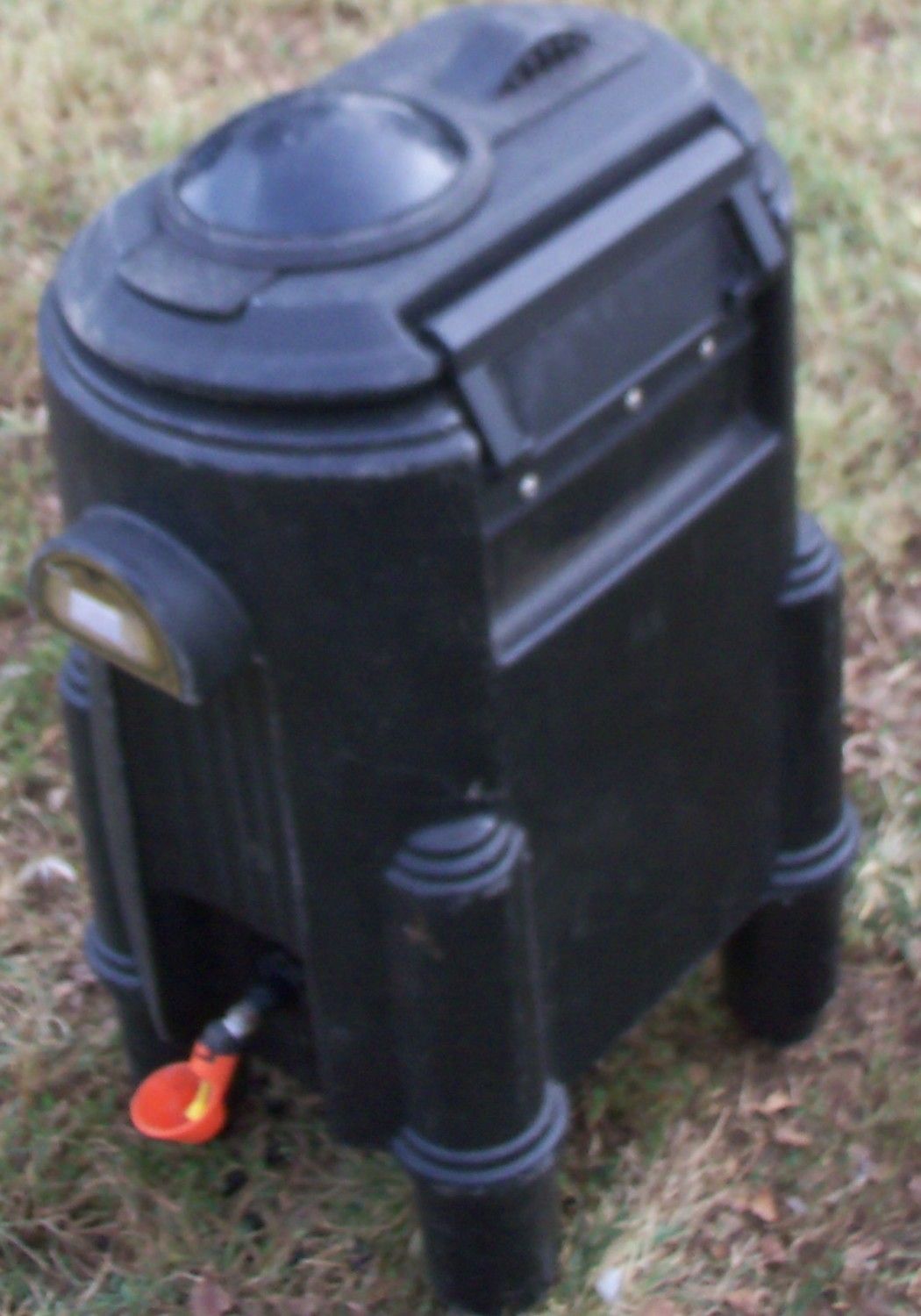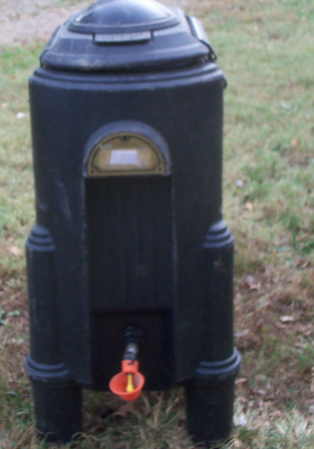 I came across these hot drink dispensers at a recycling center, and adapted a chicken drinking cup to the spigot pipe. I only found six of these dispensers, but I think they will help with some of my winter water-freezing problems. They hold about 2 gallons. I plan on using warm water this winter. I am just using cool water now, while they get use to using them. Most of my pens have these spigots in 15 gallon plastic barrows, but they do freeze in the winter.