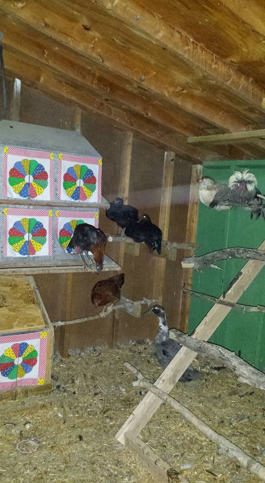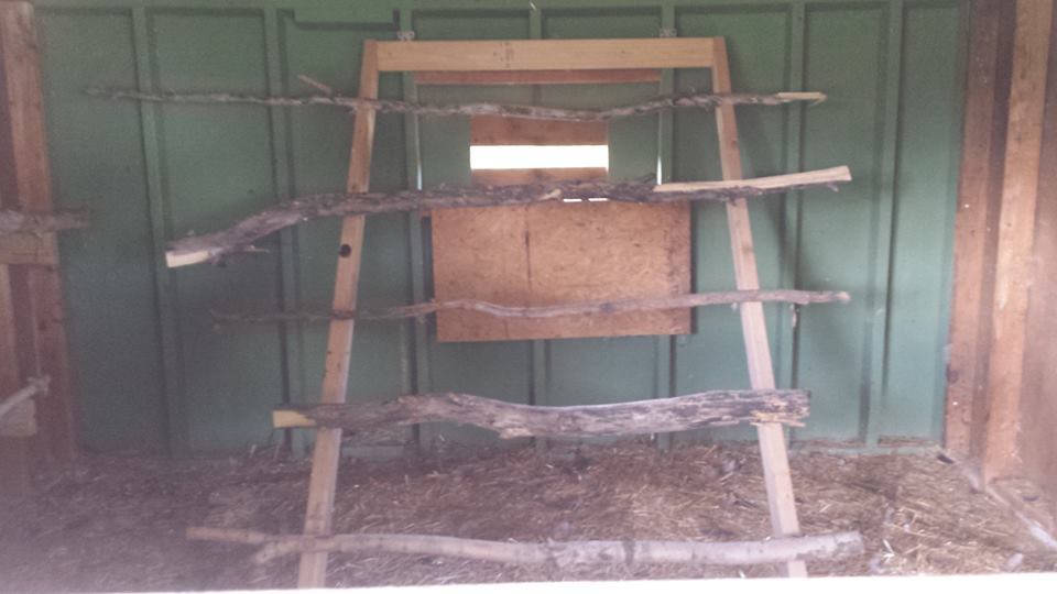 The roosts in both coops are hinged so they can be raised and hung up to scoop/rake poo, and they allow for 32 sq st of roosting space each.