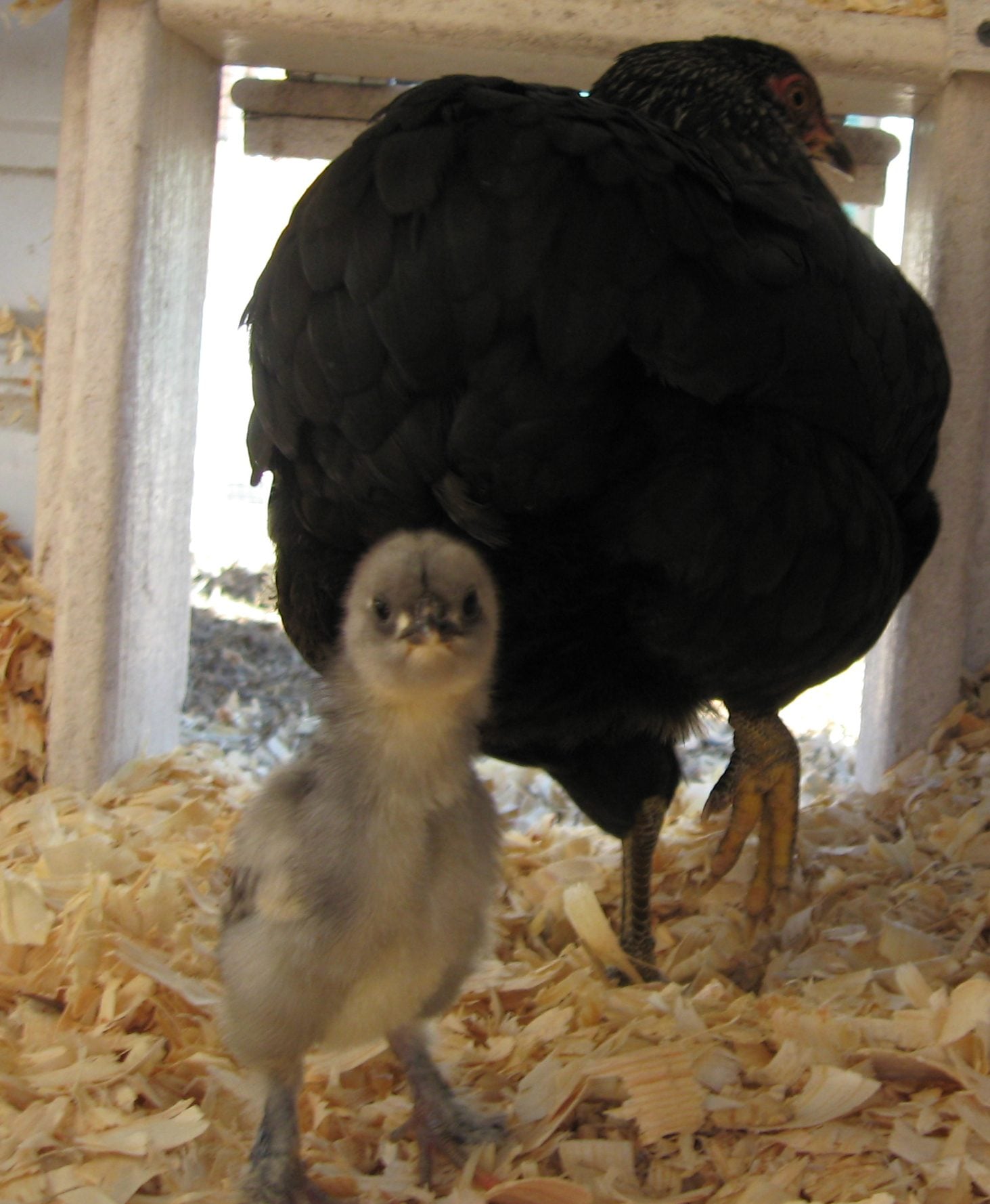 The gray one is Breda Fowl. Feathered feet and a curious expression. The Bredas and the Araucanas were raised in the house, so they are pretty tame. Mom is pretty easy going (except when she is on eggs -- then she is a tiger.)