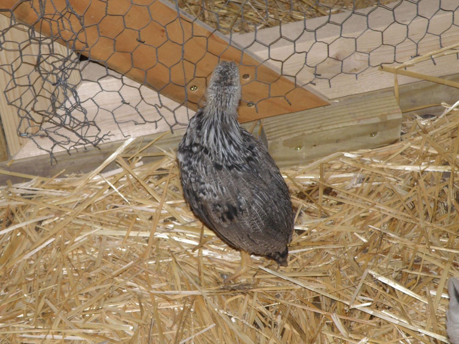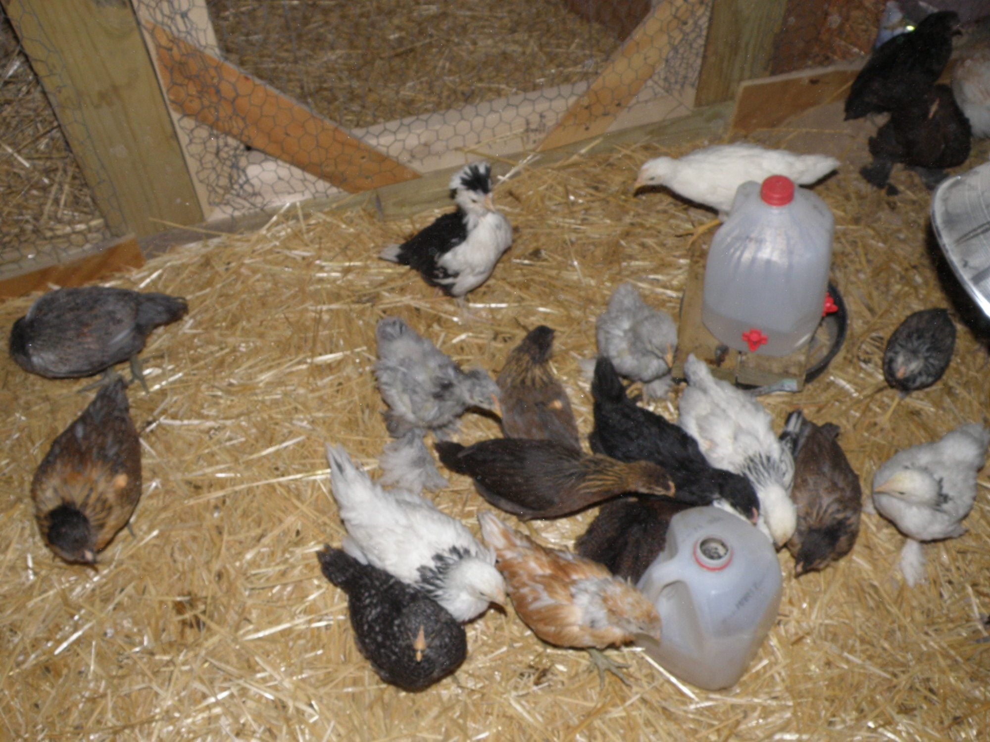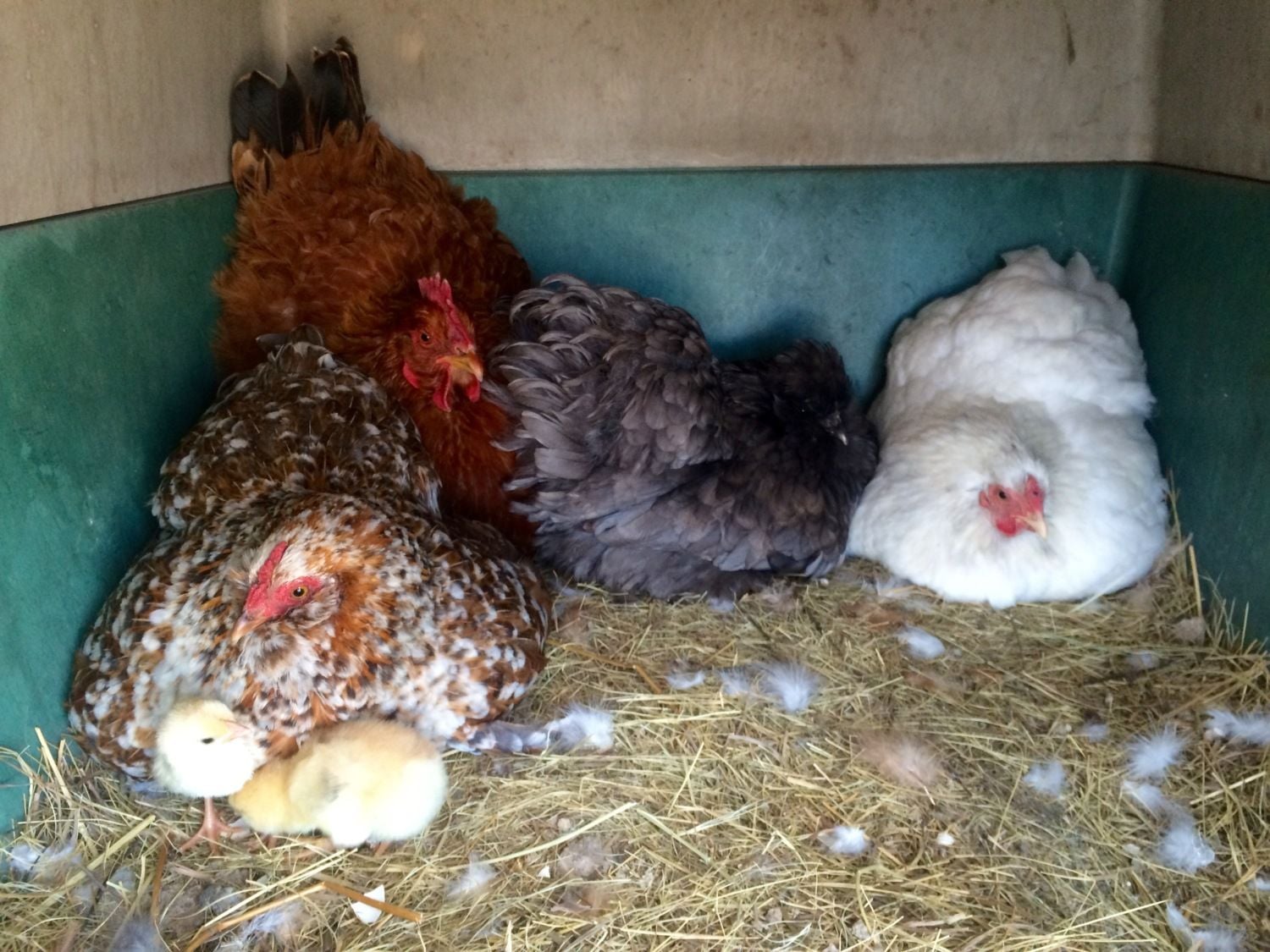 I gave them 8 eggs and it was funny to check under them - those eggs sure did the rounds. Any time a hen got up to take a broody break, the others would all hastily steal them. One thing is for sure - the eggs never got a chance to get cold. All 8 appear to have hatched. I've sighted 7 chicks at a time and haven't found any unhatched eggs. And all 4 hens are co-parenting nicely. Chicks will come out from under one hen to explore and then crawl under the nearest hen when they're ready to warm up again. Here is a photo of the 4 mama hens. Most of the chicks were under them at the time.