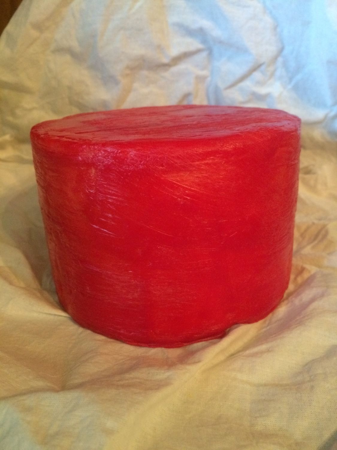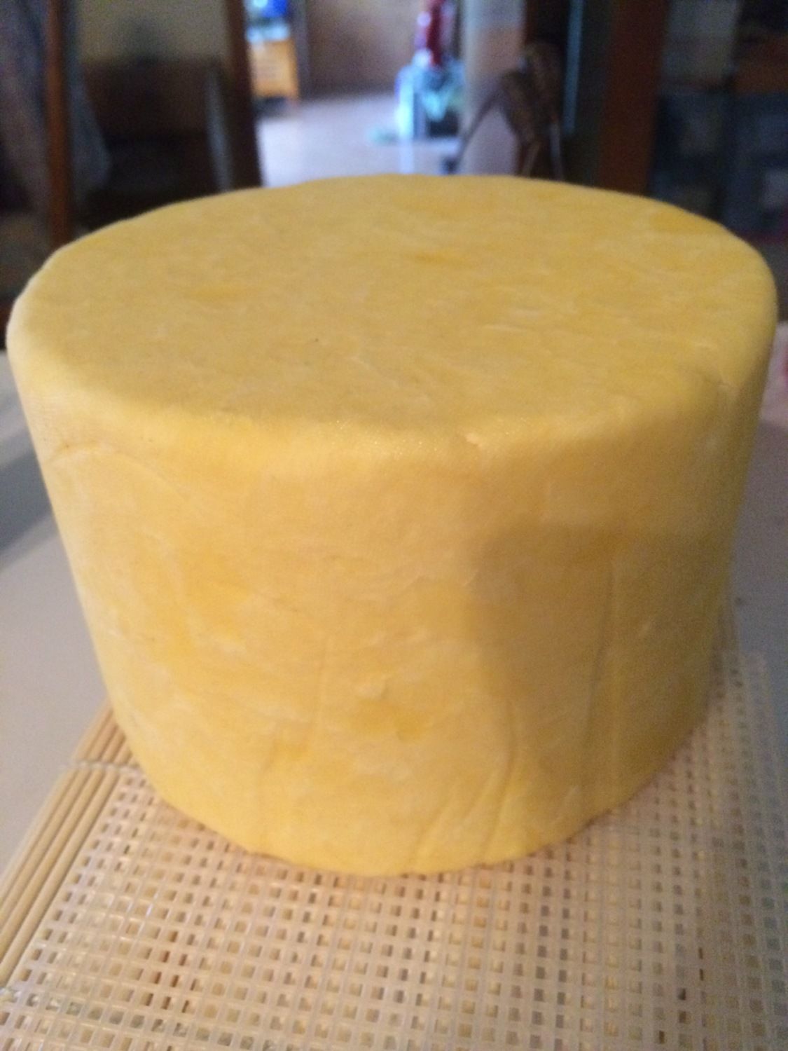 This week I also made a Cheshire cheese. This is related to Cheddar so the process is similar but varies slightly to wind up with a cheese that will be a little different when mature. It had to press at maximum press weight for two days and by the time I pulled it out of the press it already smelled amazing - and it still needs time to mature. I think it will be a very dry, crumbly cheese. It consolidated so nicely in the press and formed such a nice wheel, that I had to photograph it, as they don't all turn out this well. Here it is just out of the press: