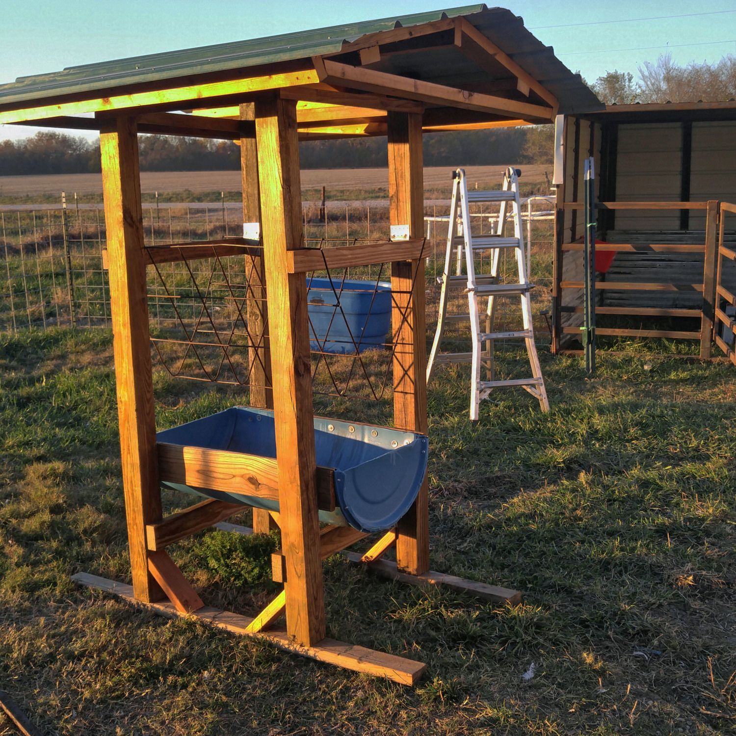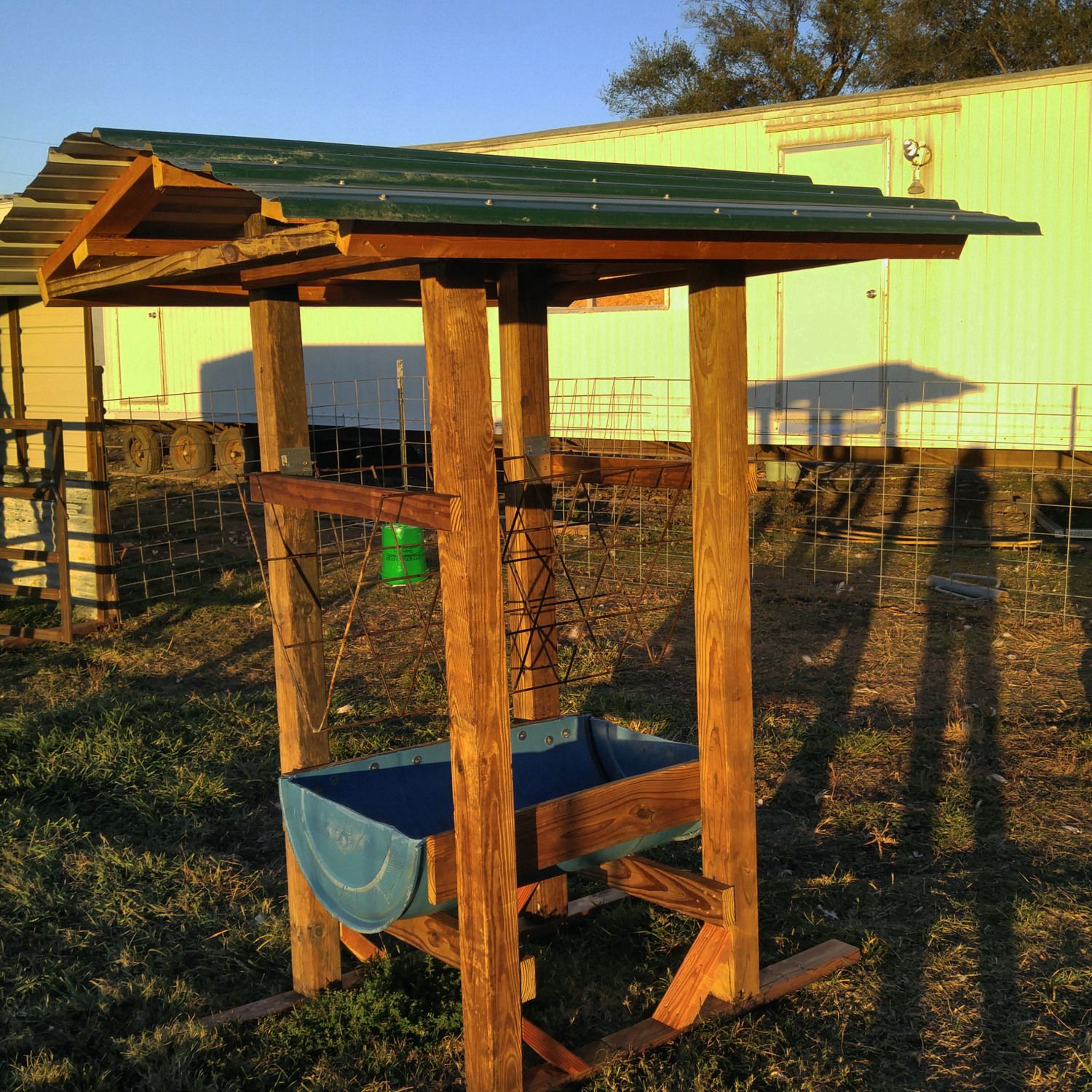 Last night I water sealed my home made calf feeder. I'm pretty proud of it because I spent exactly $0 on it using stuff I had around here, including take some 2 X 4's from the walls in the trailer I am trying to scrap out, and building the whole thing with one hand because the other one wasn't working at all. The hay feeder is made from an old livestock panel I cut and bent. The grain feeder is a plastic barrel I cut in half. It was an open top so I cut the end off the unused half and screwed it on to make it complete. All the lumber was scraps we had around. The tin on top belonged to my Dad. I brought it home after we sold my parents' home. I have one more thing to do to it. I need a cross bar on each end of the calf feeder so she won't pull all the hay out and waste it. I am going to have to cut the bar then have DH weld it on for me when he has a day off. Since I got the water seal on I decided to share the pictures I took this evening.