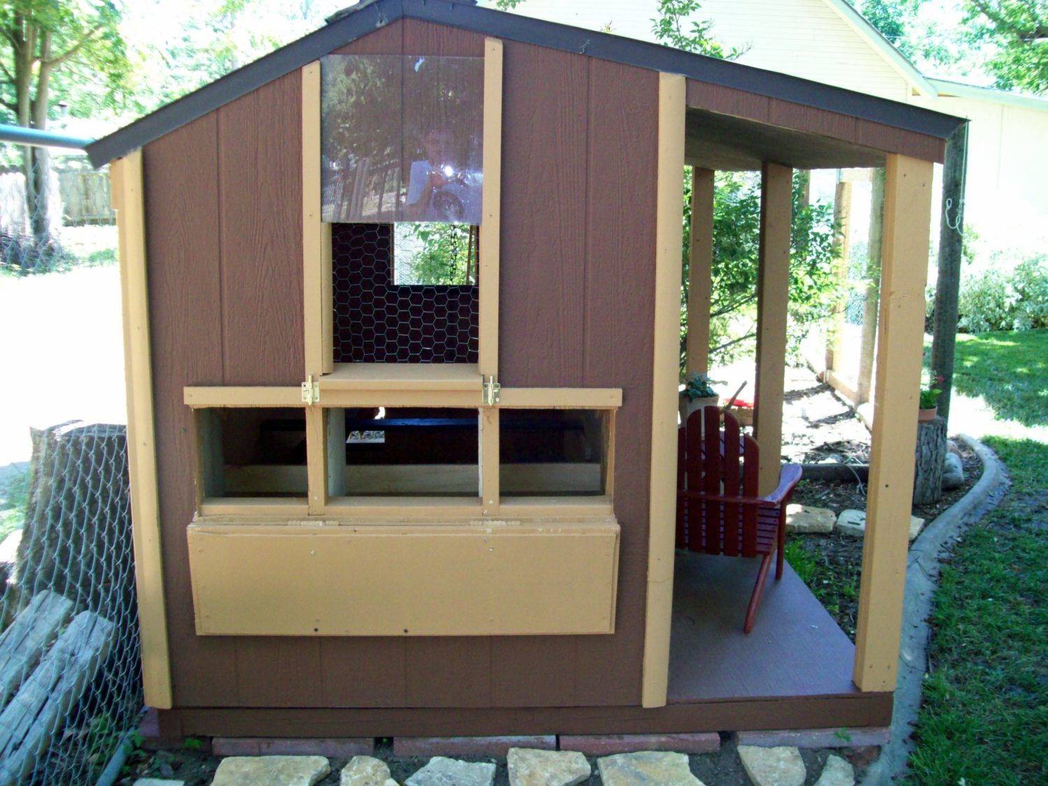 We converted my niece's old playhouse into a coop. DH put wire over the window openings and added plexiglass that can be slid up and down.