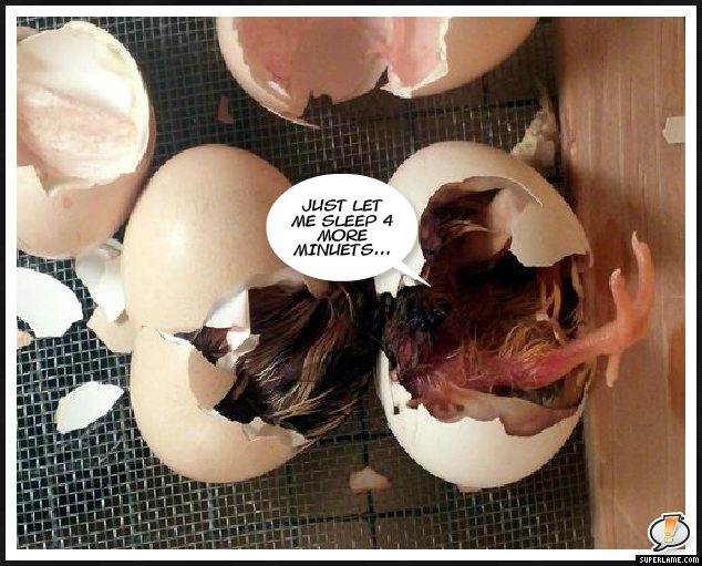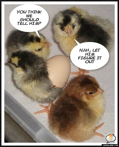 For the hatching chicks "I knew those yoga lessons would pay off!" (and "little help here, please!" from inside the other hatching egg.)