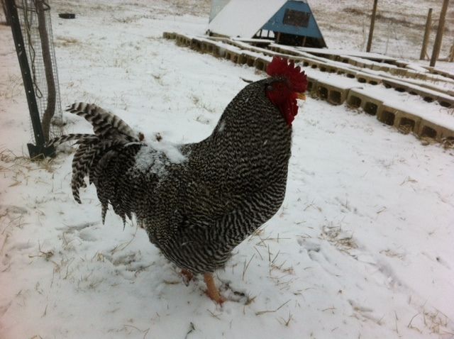 My first entry: Our barred rock rooster Flicky needs to supervise hen traffic from the barn where they