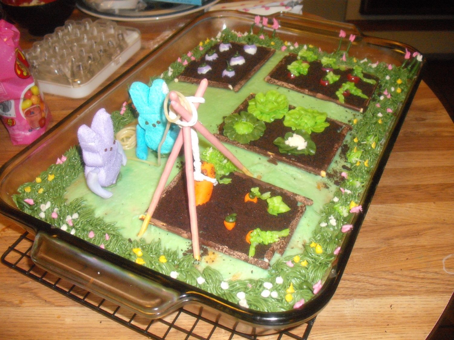 OK! This was a major headache to make, so I hope everyone enjoys it. I decided to make a garden cake! Featuring two gorilla-armed peep bunnies attempting to retrieve a massive carrot.![]()