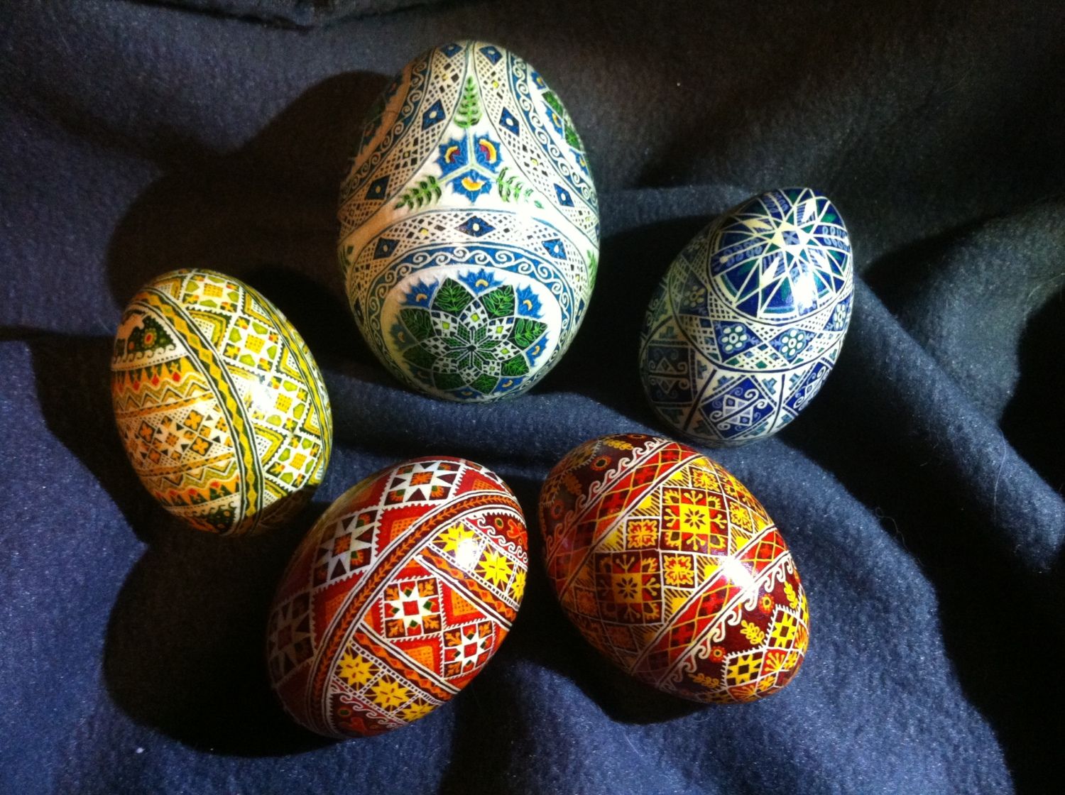 You say pysanka, I say pysanky. LOL This is the whole reason I got chickens in the first place. I got tired of buying eggs from people and the store to do my art work. So I now have around 70 chickens and ducks that keep me supplied with eggs of all sizes. These eggs are hand drawn with wax, then dipped in the lightest color of dye...then more drawing with wax, and dipped in the second lightest color, etc, etc, until you end up with an egg covered with wax. I then take the egg and hold it over the open flame of a candle and wipe away the melting wax bit by bit. It takes around 4-6 hours to do one egg from start to finish. Enjoy!!![]()