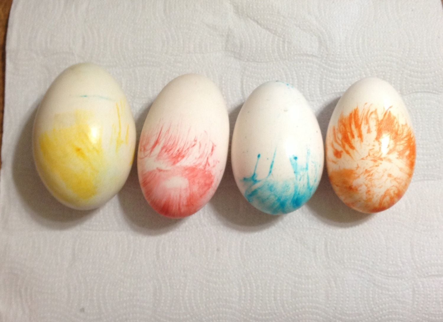 Natural art. Very pretty.Here are my entries. These eggs were painted by the geese themselves. I didnt know who was laying and who wasnt because of a shared nest, so i dabbed the outsides of their vents with different colors of food coloring, as the egg came out the feathers around the vent painted them like tiny brushes. Afterwards all i had to do was match the egg with the gooses bottom. Its non toxic and doesnt harm the goose in anyway.