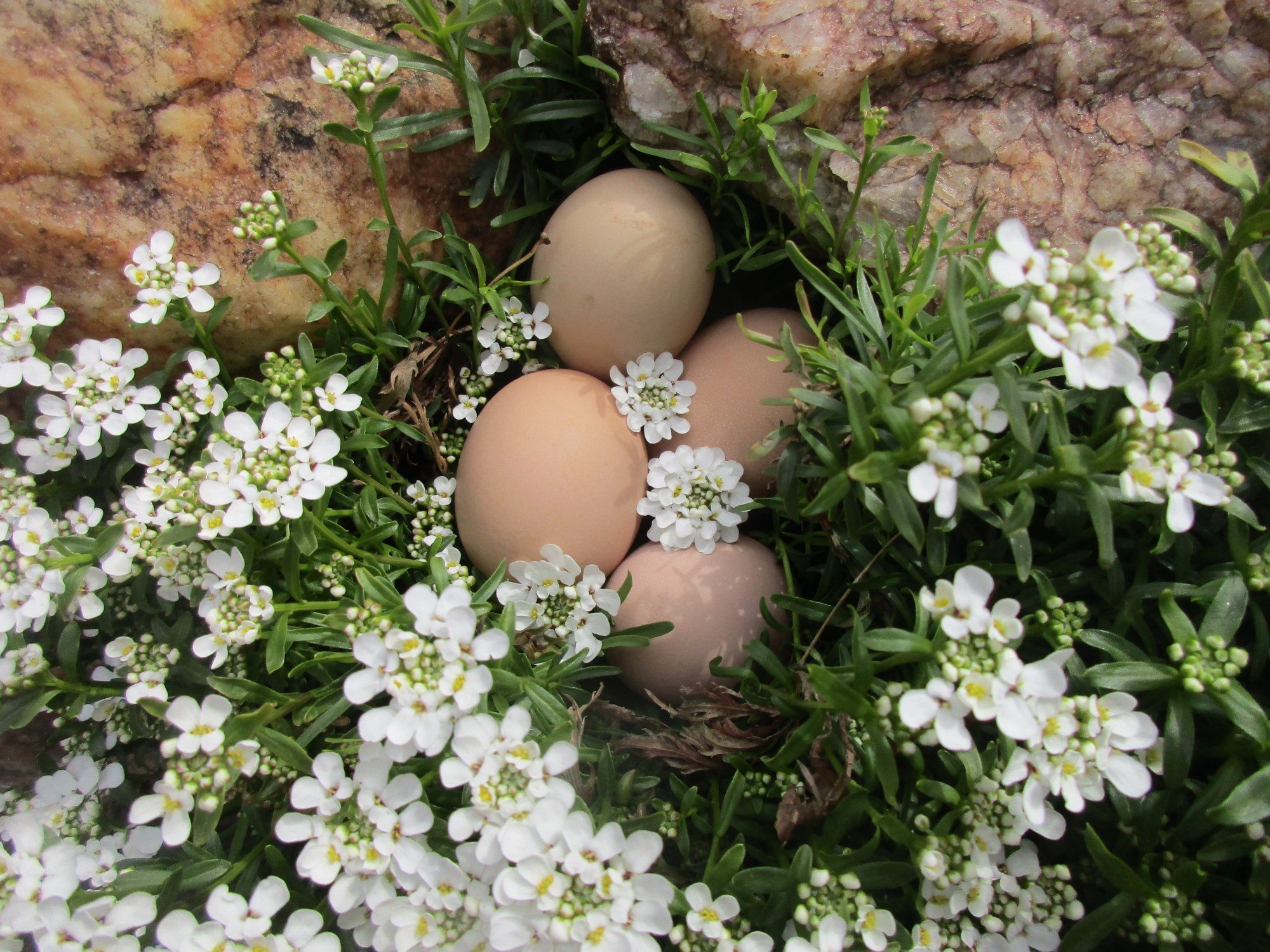 I like the color of the eggs echoing the color of the rocks ( quartz I think) and the wild flowers are the icing![]()