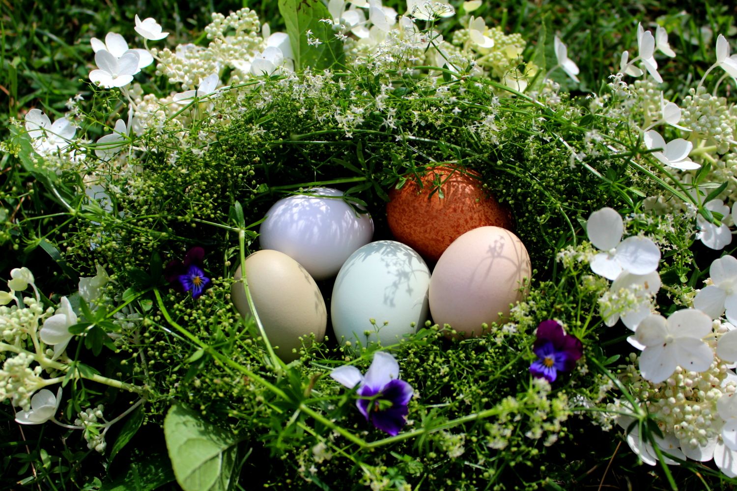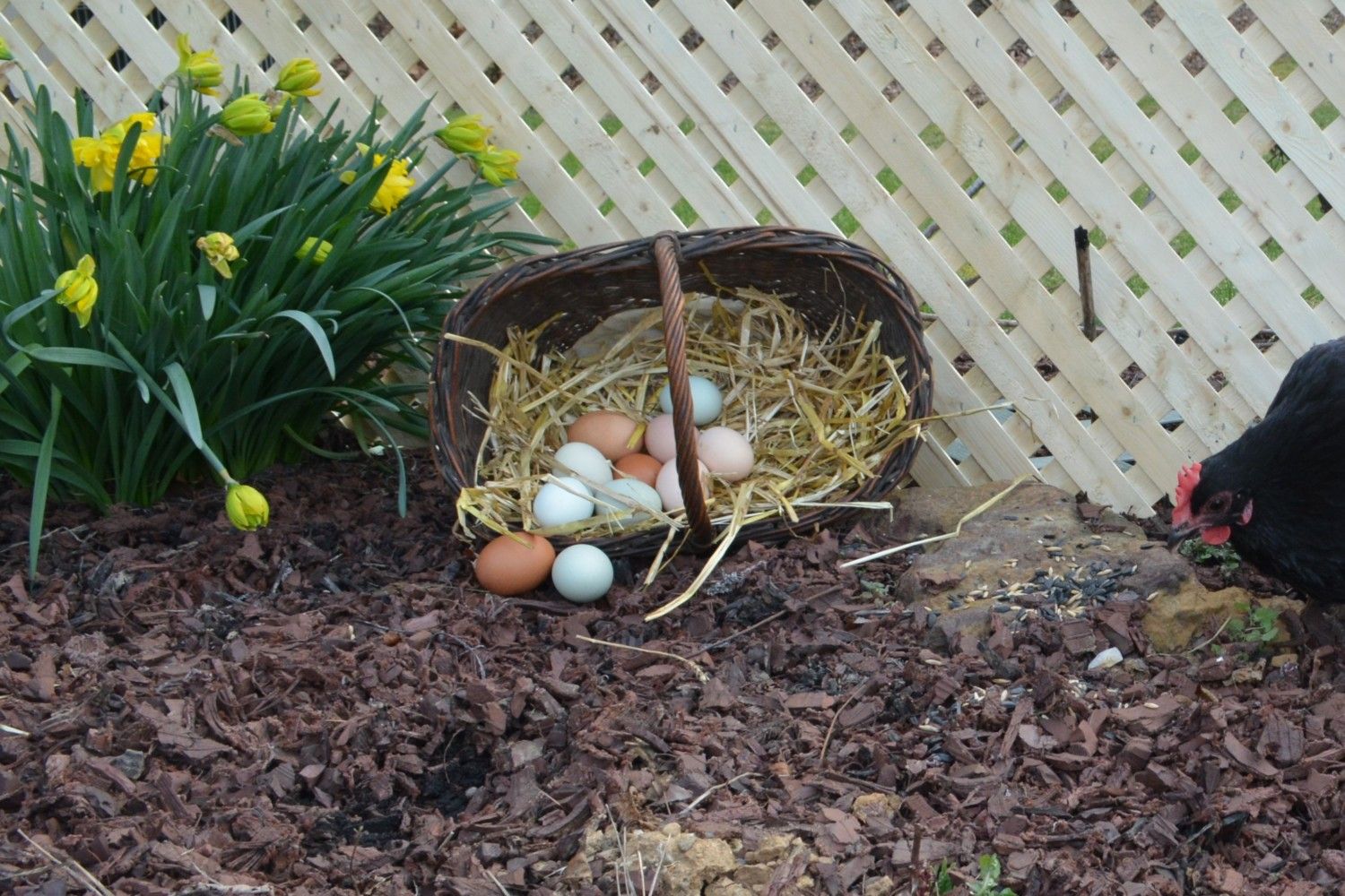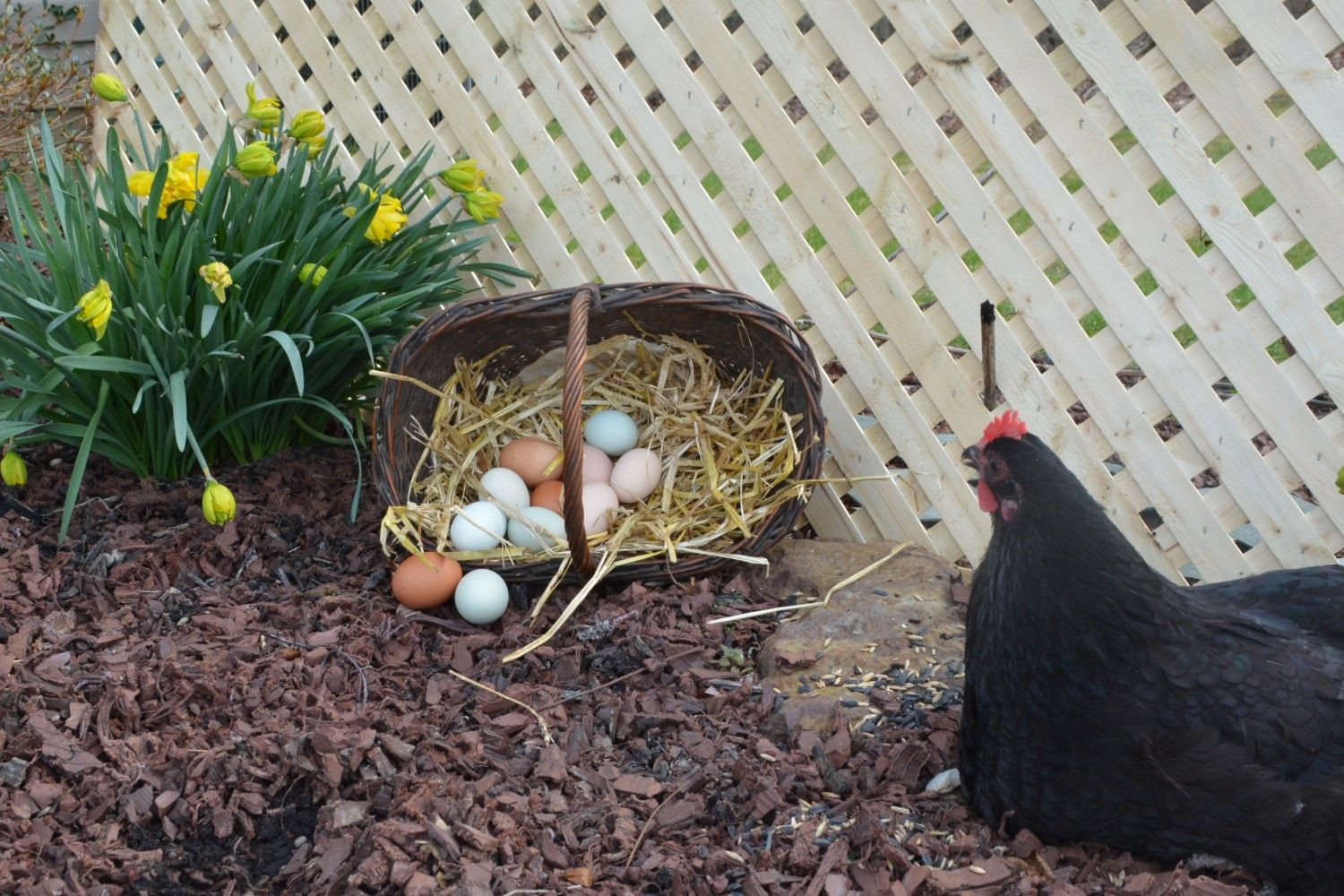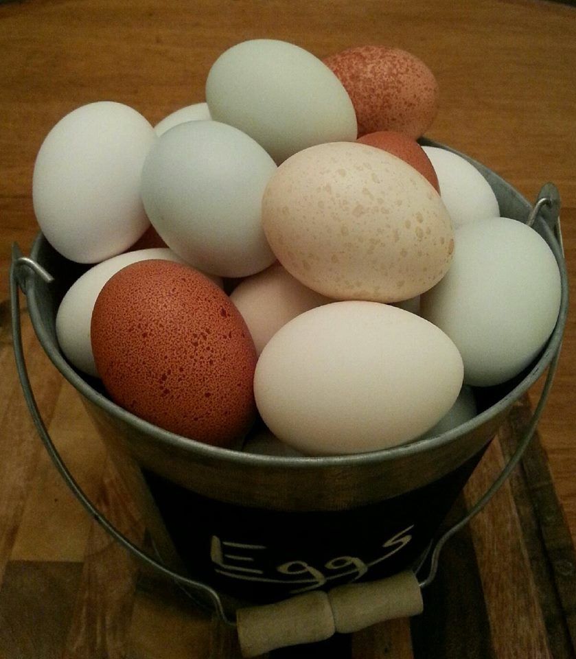 (Clockwise- White leghorn, Welsummer, Salmon Faverolle, EE, EE. )