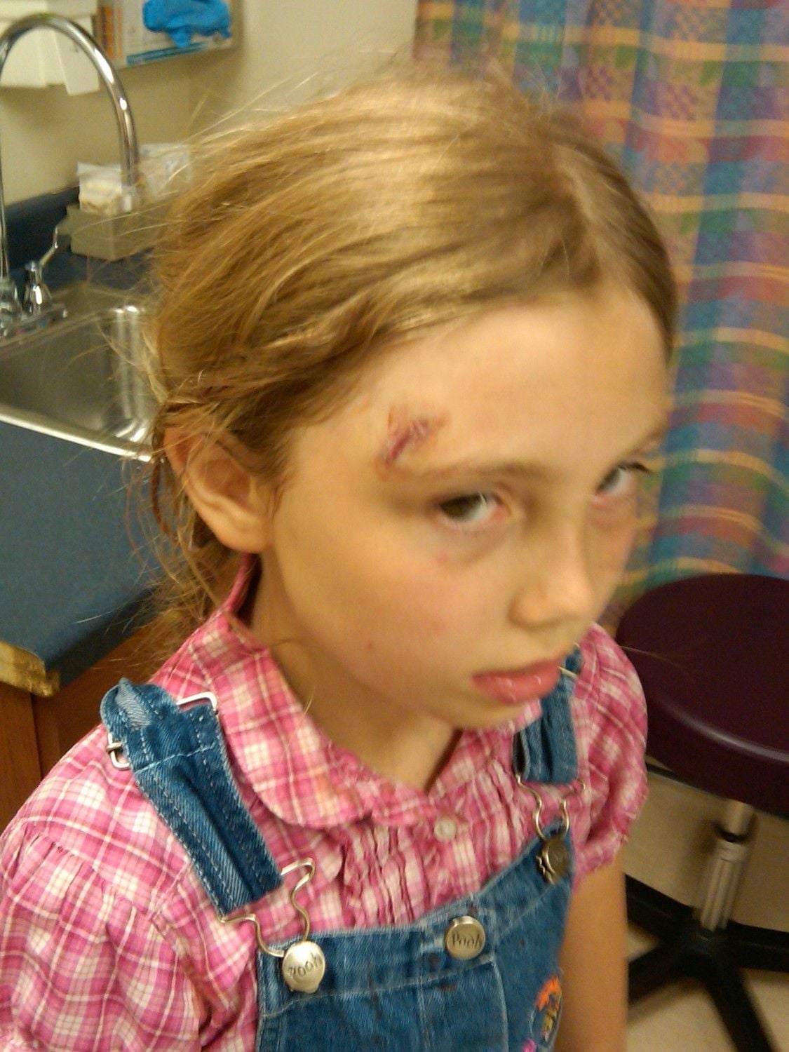 DD sporting some tissue glue after the horses spooked and kicked a bucket that flew into her head... She was more worried about the possibility of having to have a lidocaine shot than the actual injury... The doctors couldn't believe that at 11 years old, she knew what lidocaine was...