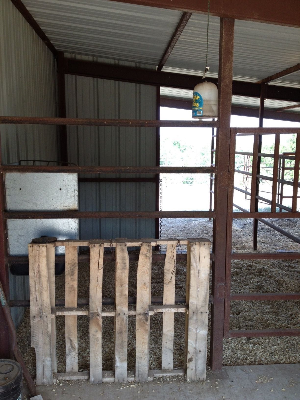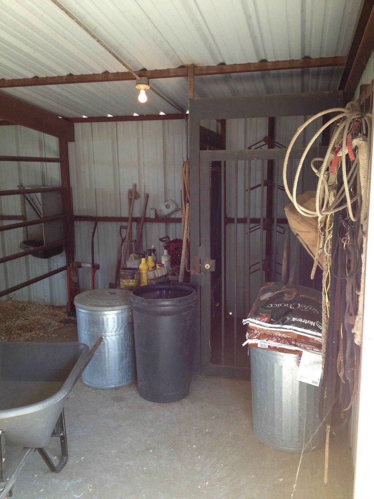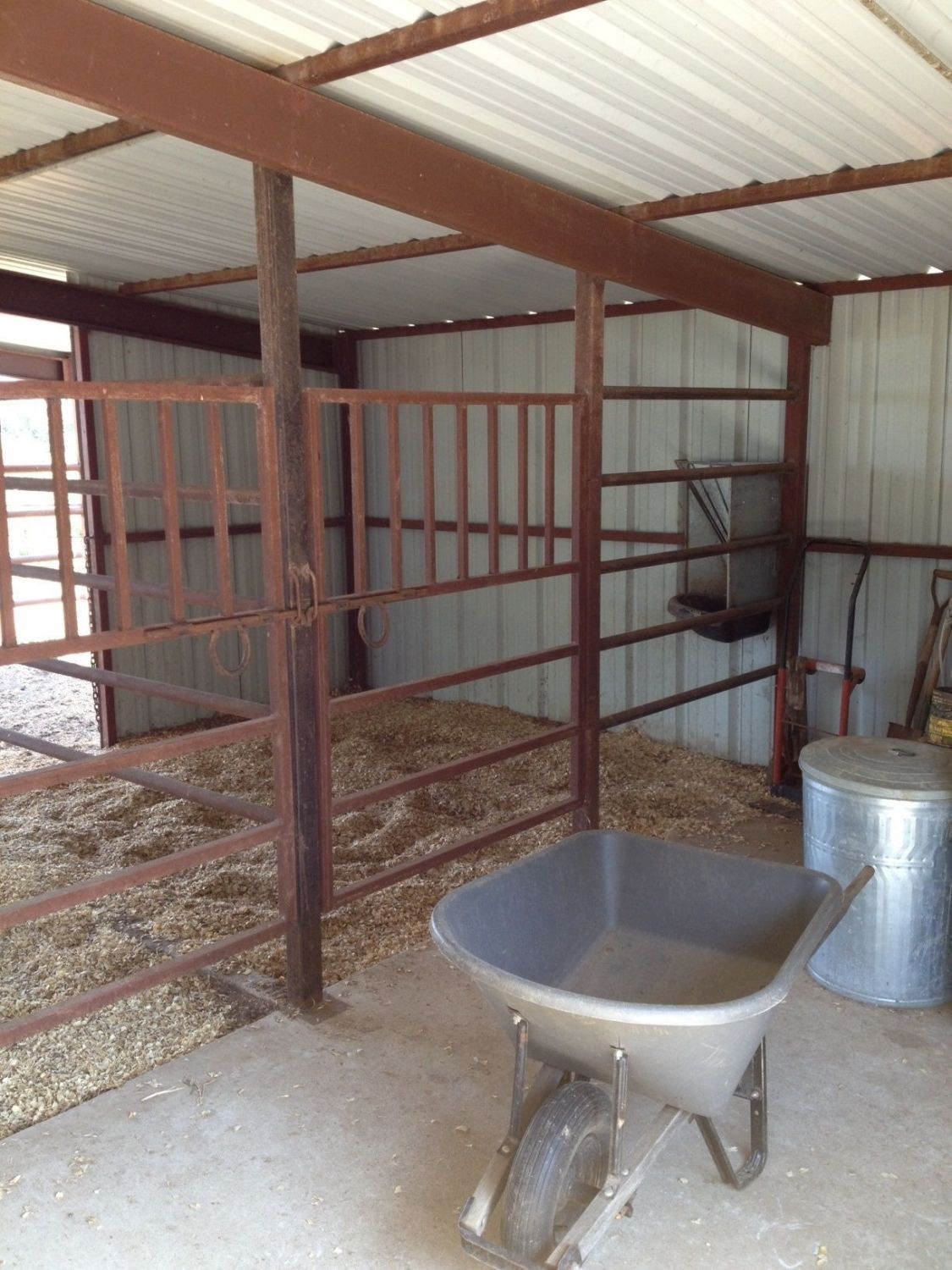 What is not very visible is the corral on the other side thru the opening you can see sunlight thru. You've got a covered "porch" outside there and then an open corral with cattle panels on all sides.