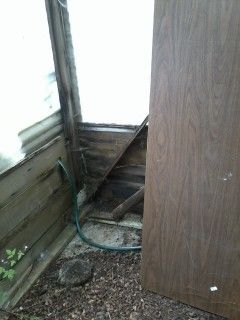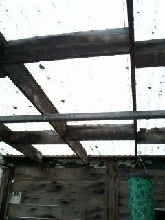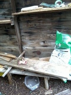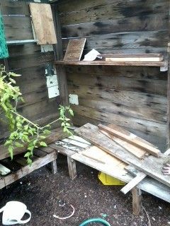 We've been using it as a greenhouse anyway, though all we've done in it so far is start some tomatoes and hang a couple of Topsy Turvy planters. Then more light was blocked by a shed built on the west side--the side with the biggest stretch of fiberglass, short of the roof. A couple of weeks ago, my husband and I were discussing ways to become a little more self-sufficient, and chickens came up...