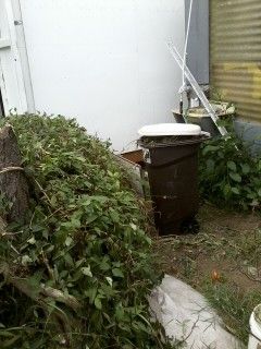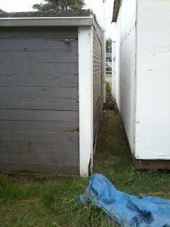 The pictures of the space between buildings are from the back, because I'd pulled a lot of stuff out so I could see the walls and take pictures. I didn't pull everything out, because 1) I couldn't shift the tables by myself, 2) I could see the space well enough, and 3) I'd just been tossing stuff out the door, so there wasn't any room...