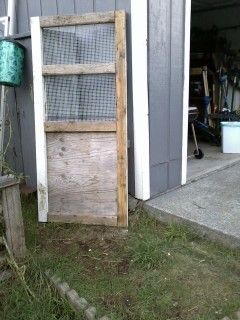 It's taken nearly a week, what with my being out of town, and it raining, but we have a people door! It's not hung yet, nor is there any hardware on it yet, but it's a door. Heavy thing--glad I decided to build it on the cement part of the driveway, which is even, though not level, and right next to the coop. Even if I did have to tell both girls (and the dog) to stay away when they came out, as the framing of the door was all nicely squared but nothing was fastened yet!
