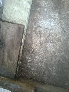 When I shoveled the bark chunks (contaminated with paint chips, rusty screws, and broken glass) and swept, I learned that the slab was poured the same year I graduated from high school.