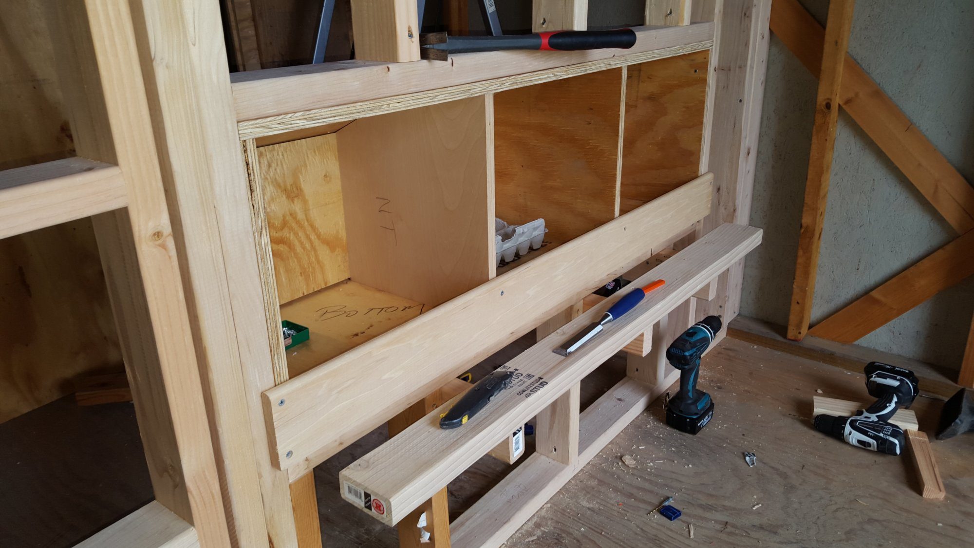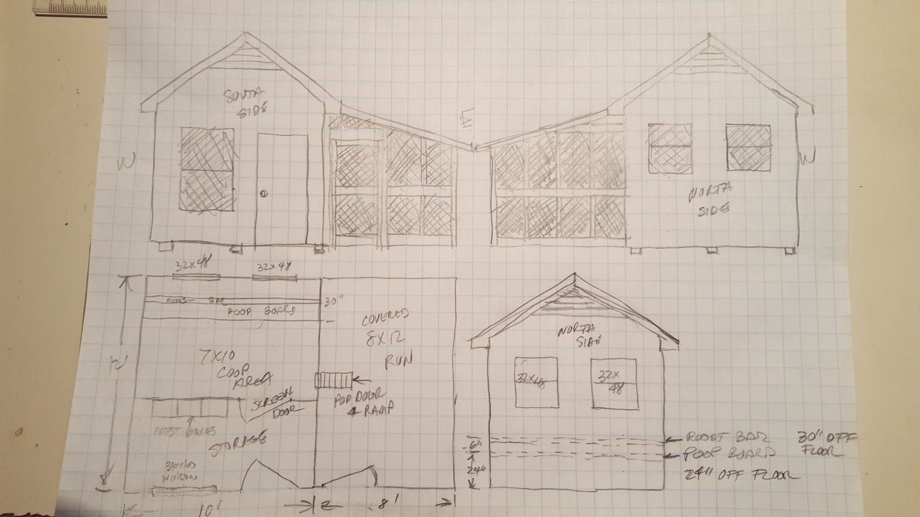 I was concerned with putting the windows above the roosting area, but it is the best place to maximize cross flow of air. I will start framing the interior wall between the storage area and the coop tomorrow and build my nest boxes too. The I will begin to tear off the old siding and frame up the space for the door and the window on the front of the shed. Then tear off the siding in the back and frame up for the two windows at the back of the coop. Got most all of my lumber here so I just have to get my air nailers oiled and ready to work.