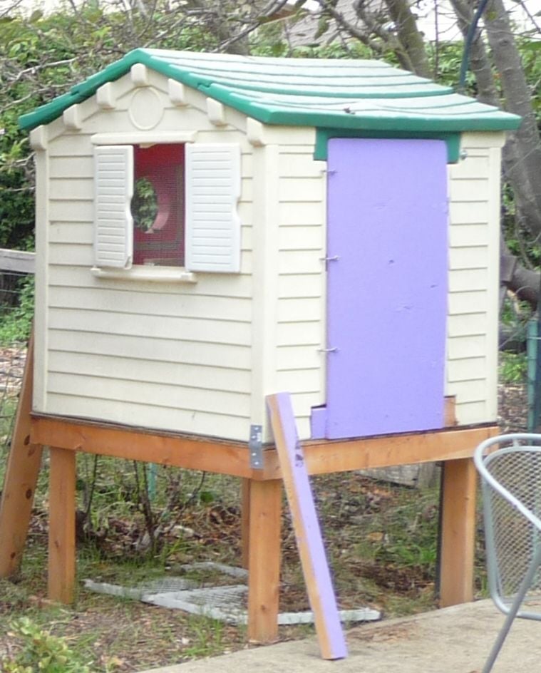 Do all roofs leak on these houses? I live in Colorado and want to use either a Tikes playhouse like the duplex types above or a wood playhouse. Problem is our winters can get pretty bad cold with heavy type snow but I live closer to Denver not mountains so snow hasn't been an issue lately =) I have 3 hens btw =)We got some wide head screws, Teks #8 lath screws. There is 1/4" hardware cloth over the windows. Worked great for the summer while the chicks were growing and we were building a permanent coop and run. Ours was old and the roof leaked, when I checked on it after a storm this winter so glad we didn't stay with it. The roof condition was on of the thing that pushed us to a different hen house, rather than just building a run.