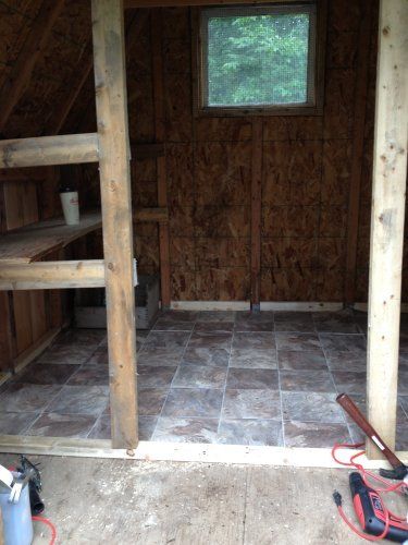 I put down the floor and couldn't get the linoleum to completely cover the floor, so clean-up may be annoying, but once I find a bigger piece I'll replace it. I'm going to be using wood chips because I've liked them so far and have free access to them. I'm not really worried about the heat as I am the Winter. -30 is pretty chilly here in the Winter! I'm making sure of drafts and covering any little holes.