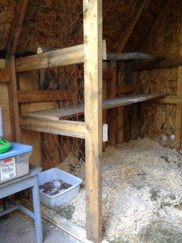 Water is hanging and food is on a plateform. Chicken wire was attached to the inside door we made, as well as the sides, so we can open the main doors during the day and let in light, and air. DE, hay, DE, shavings, a bit more DE went down. More will go down the colder it gets.