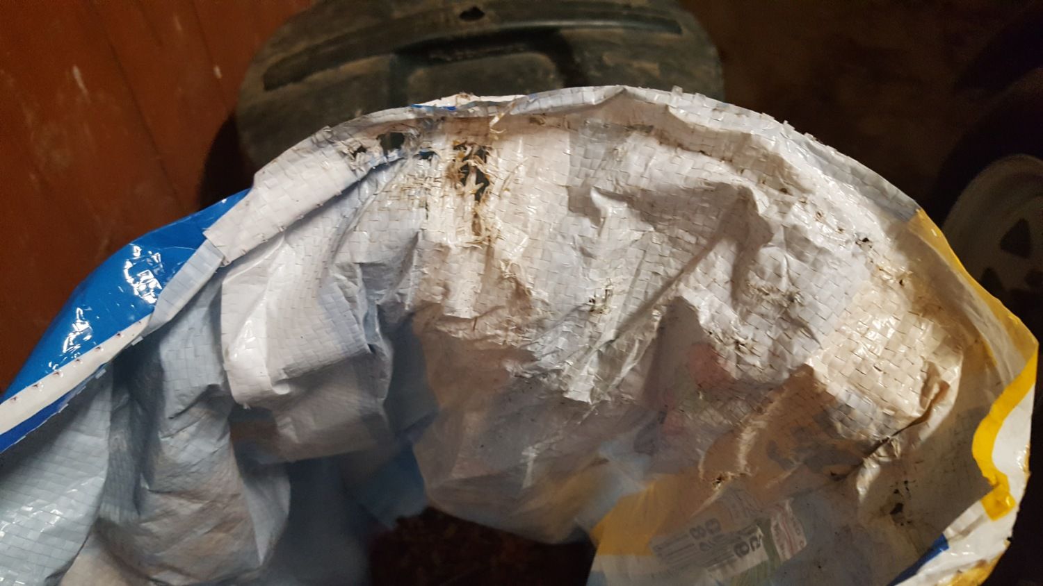 That was a coon attempting to rip the remnants of a 30 pound sack of cat foot through a 1 inch hole. He got a whole bunch of it through. Laughing, I tried to get it out. Tried harder......tried really, really hard and with some effort, finally managed to pry it back out.