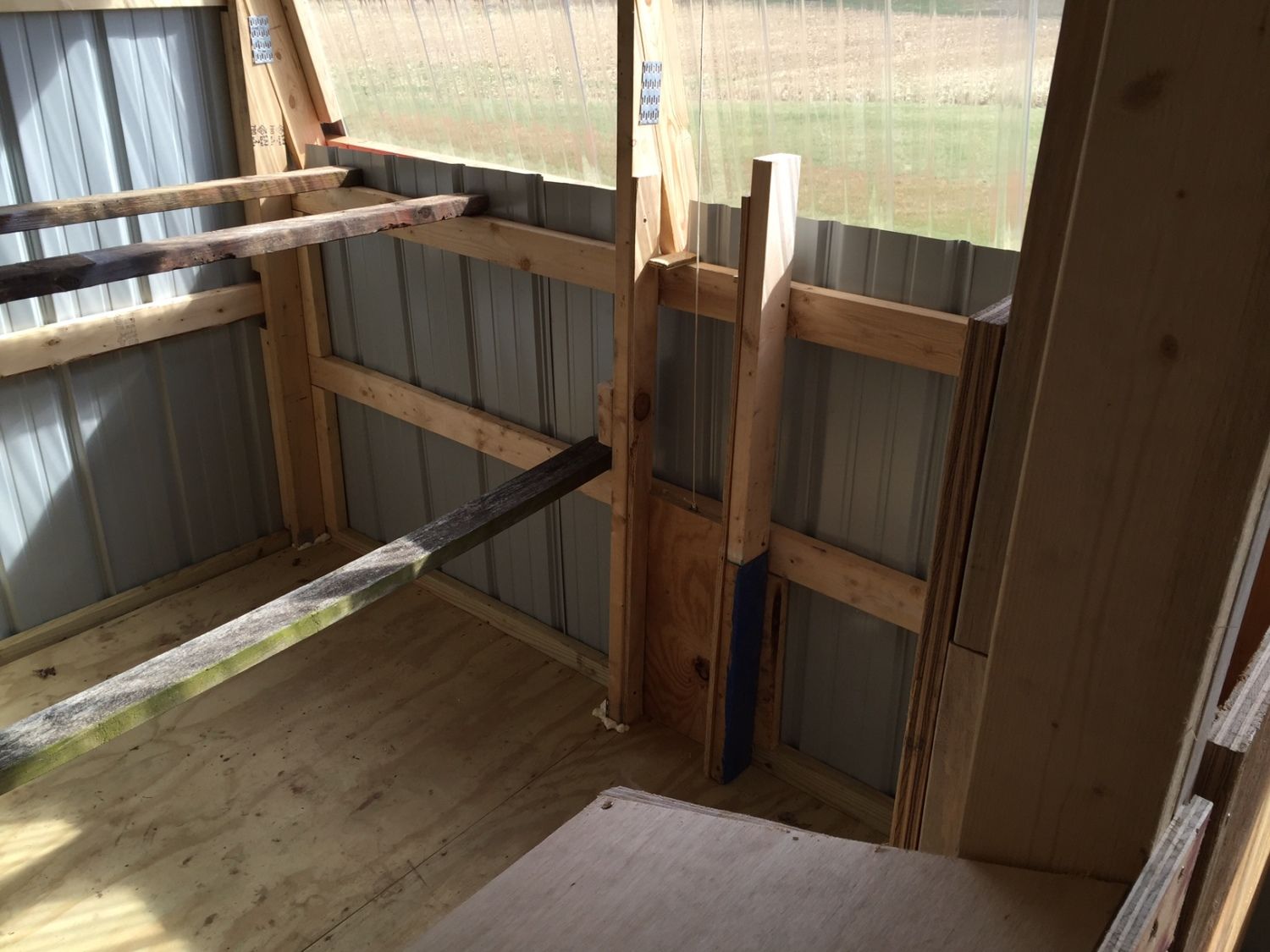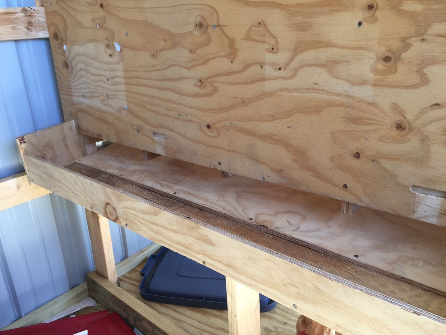 The original plan called for a ladder style roost that hinged off the back wall for easy access when cleaning. That has been eschewed for the time being because I ran out of lumber needed to accomplish it. Also, you will notice that the top two roost bars sit basically at eve level. Any higher (as the ladder plan called for) would means birds are roosting above the primary inlet of air. I prefer this not be the case. Also, this allows for more roosting area at max height, hopefully reducing bickering. So we are going to try this for the time being.