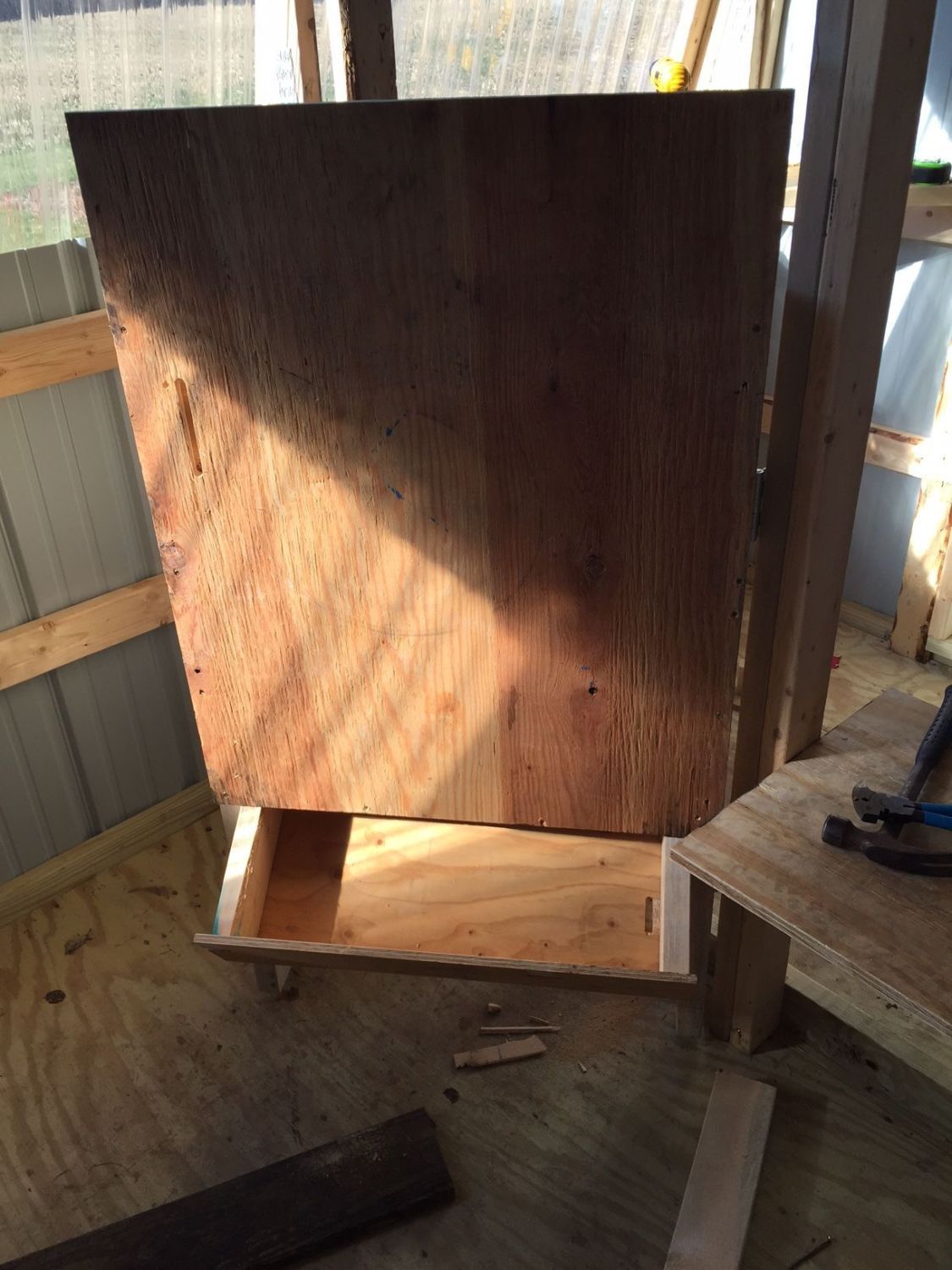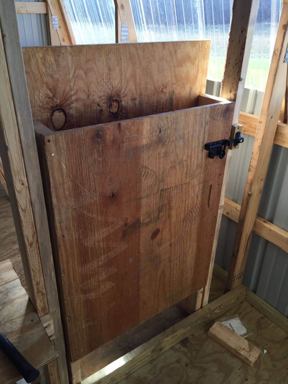 A look from human area into chicken area from above the nesting boxes. The pop door is installed and functions with a pull string that goes into the human area. There is a stopper on top of the second perlin that prevents the door from coming out of the track. It's tough to see, but inside the 2x4 support on either side, I simply nailed a strip of plywood with 1/4" gap behind the door. This allows for it to travel easily, without binding, but not get mangled so it won't slide. The plan is to eventually install a motor on a timer. The door is 3/4" plywood and quite heavy. The door sits behind the perlins and the nailer on the bottom of the structure, so prying raccoon fingers can't get under the lip. It's also quite heavy.