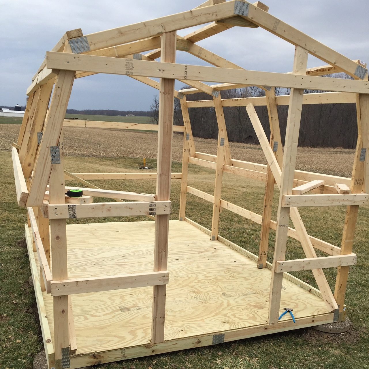 The original plan was to stick build the entire thing, but the EZ-frames from Menards saved materials and the headache of the math of a gambrel roofline, which I preferred to gable because of the ability to add ventilation without it needing to be windows or doors that can allow in weather (more on that later). I had wind issues during construction, which meant setting 8' tall frames by myself was a chore, but I managed.