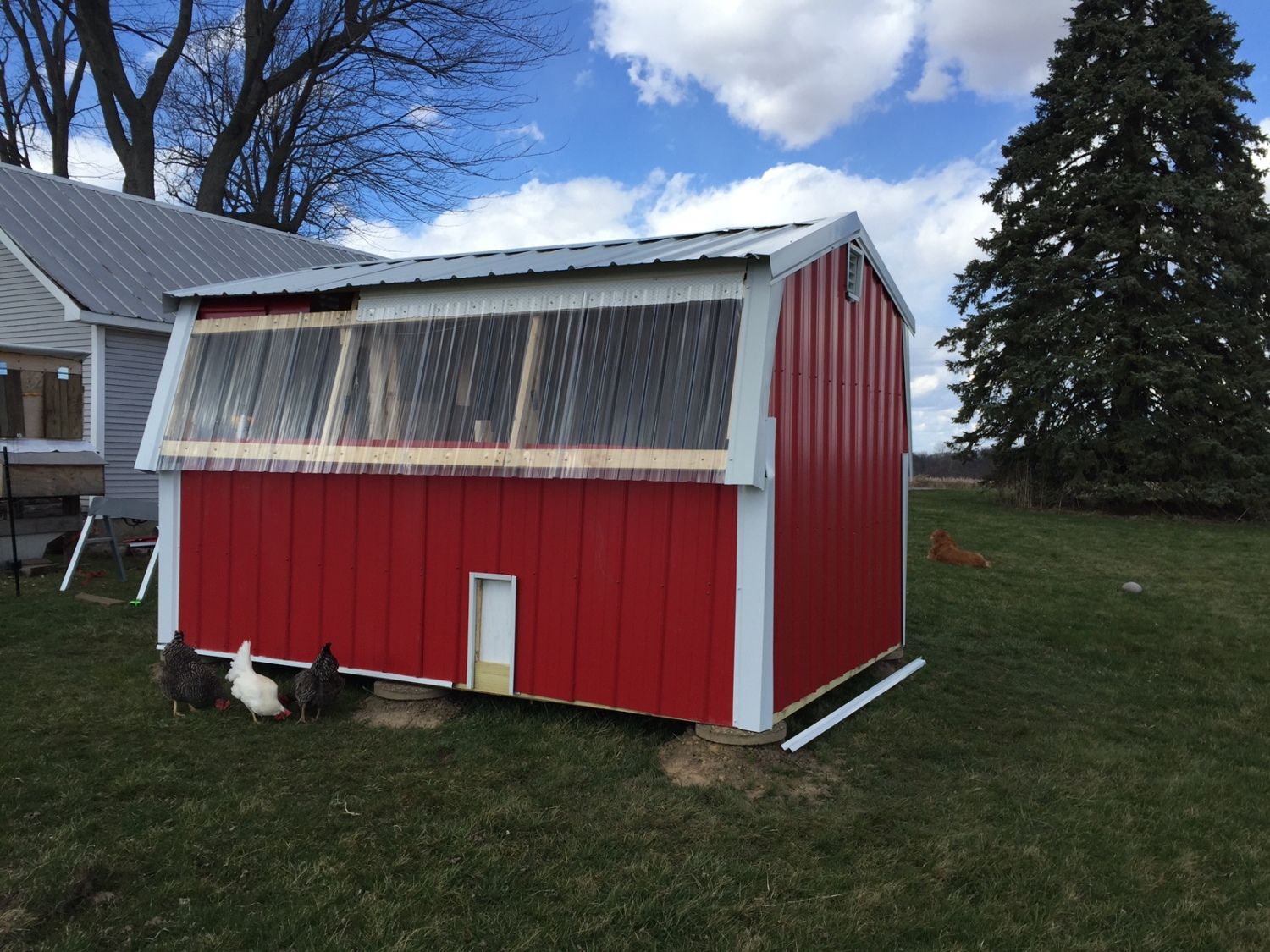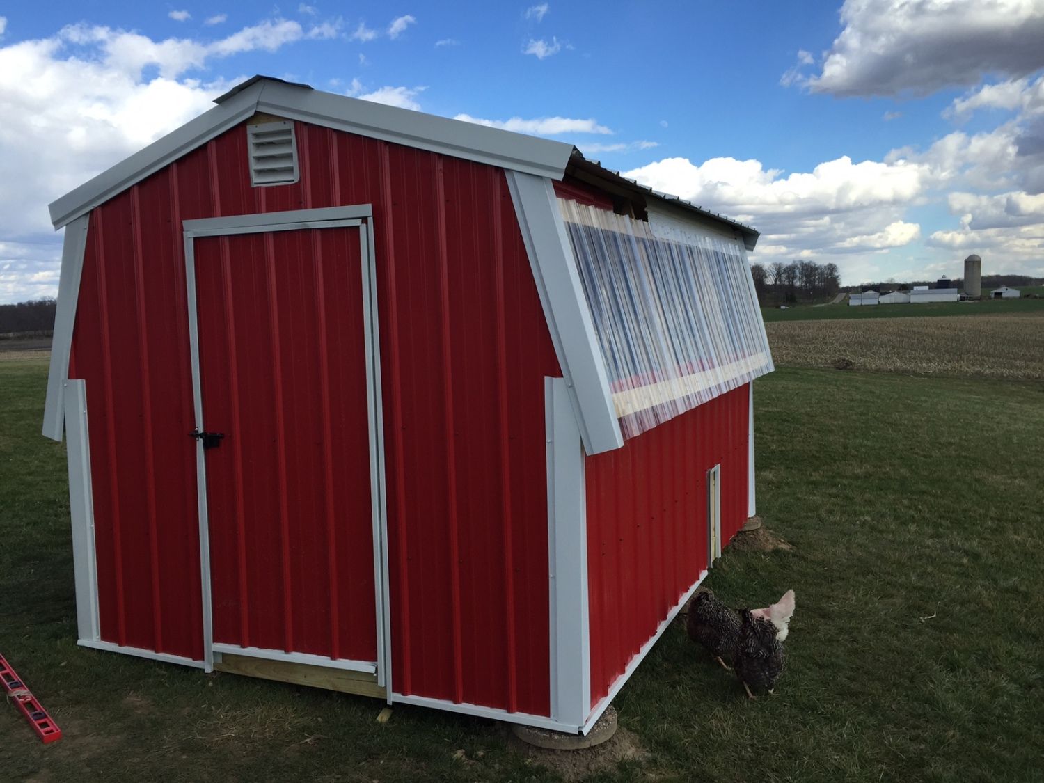 Hanging steel is just hanging steel, so I left those images out, but here is the almost finished exterior. I used clear panels on the lower portion of the roof to allow for maximum light. This facing of the barn points south, so all available light will funnel into the coop. There are a couple pieces of trim to finish, and the run still needs built. It will be 12x20. It will also have a swinging lower half on the 12' facing to allow for a large door for ranging. But the coop is essentially done, and I wanted to share.