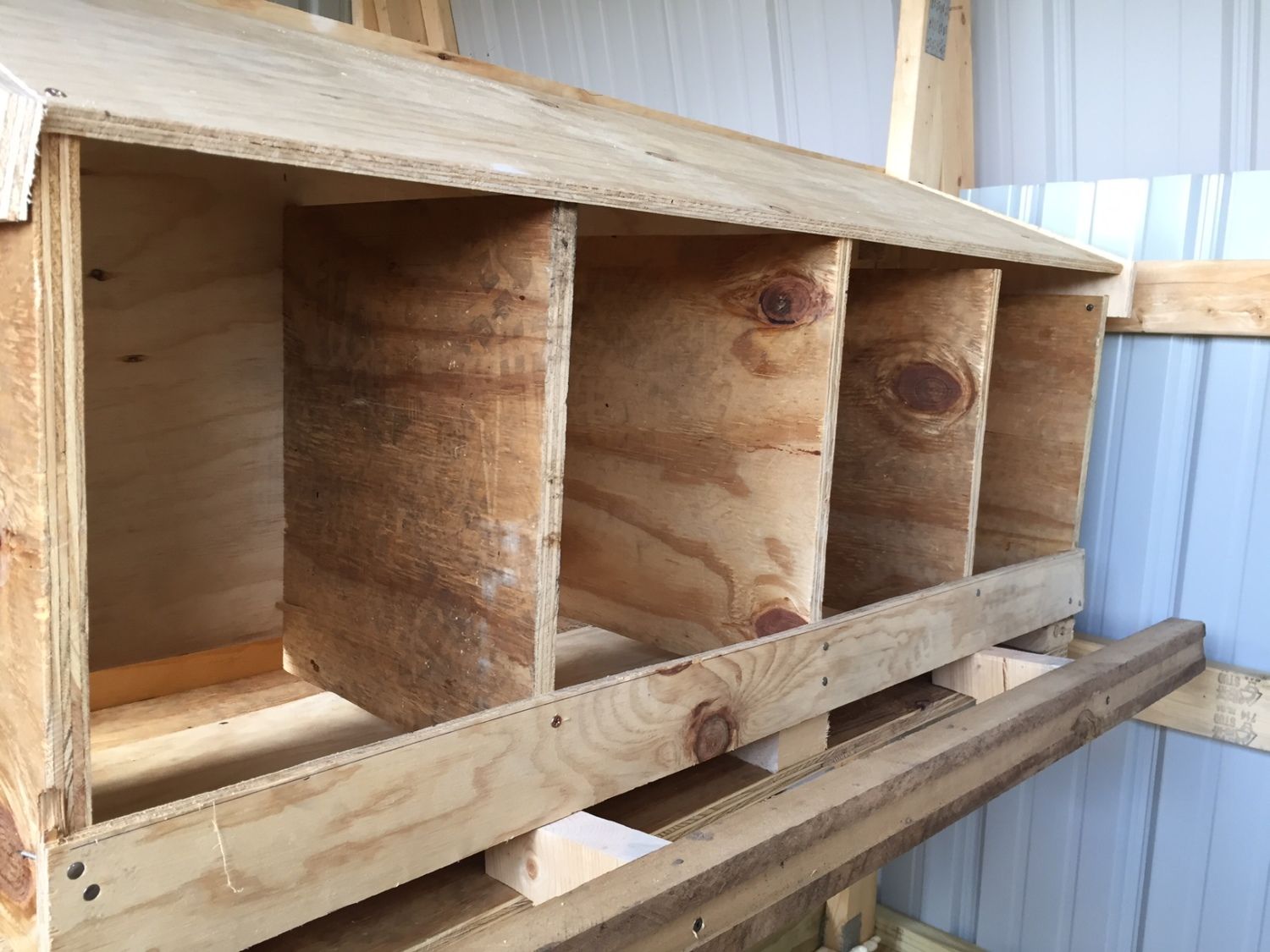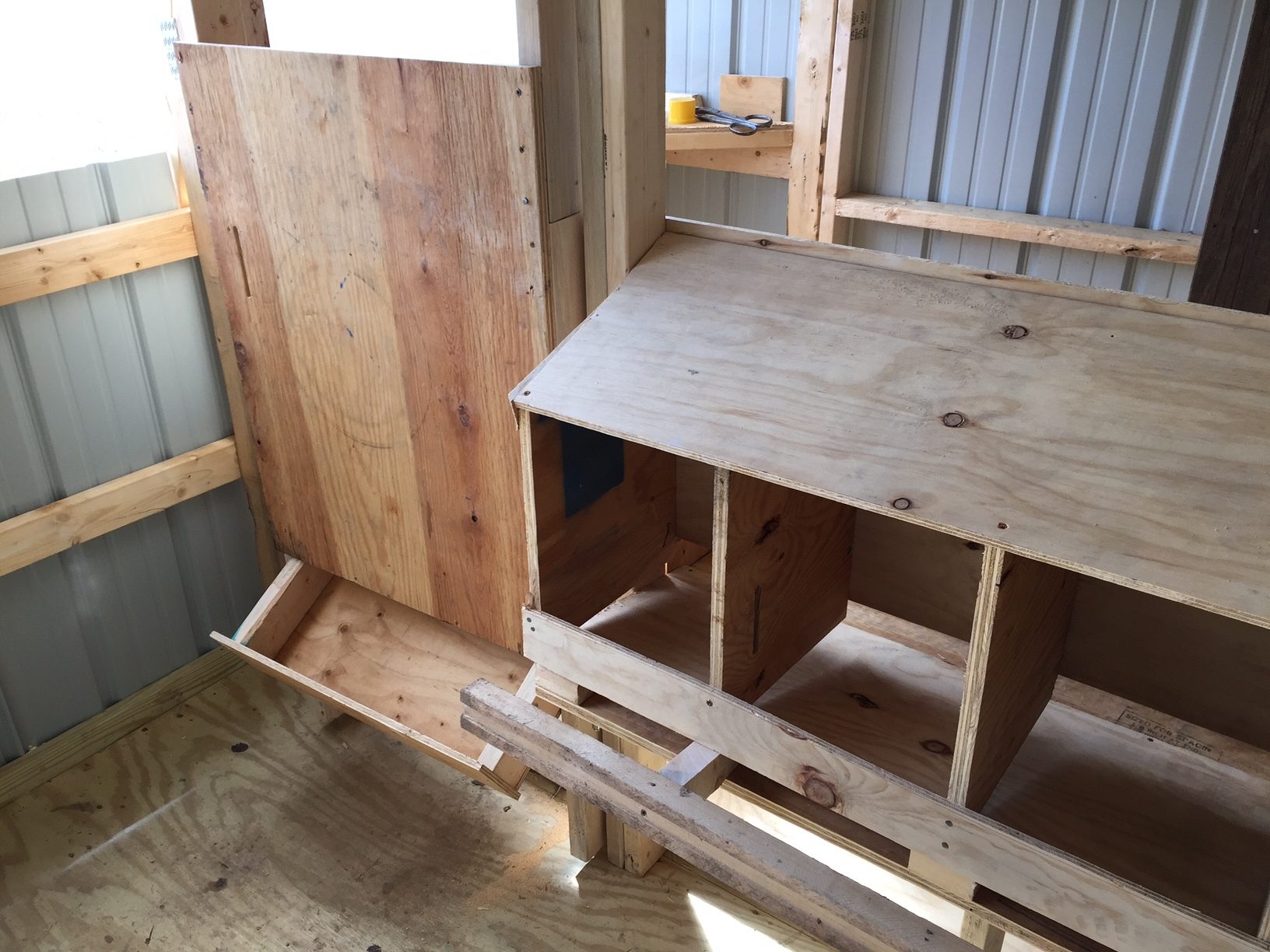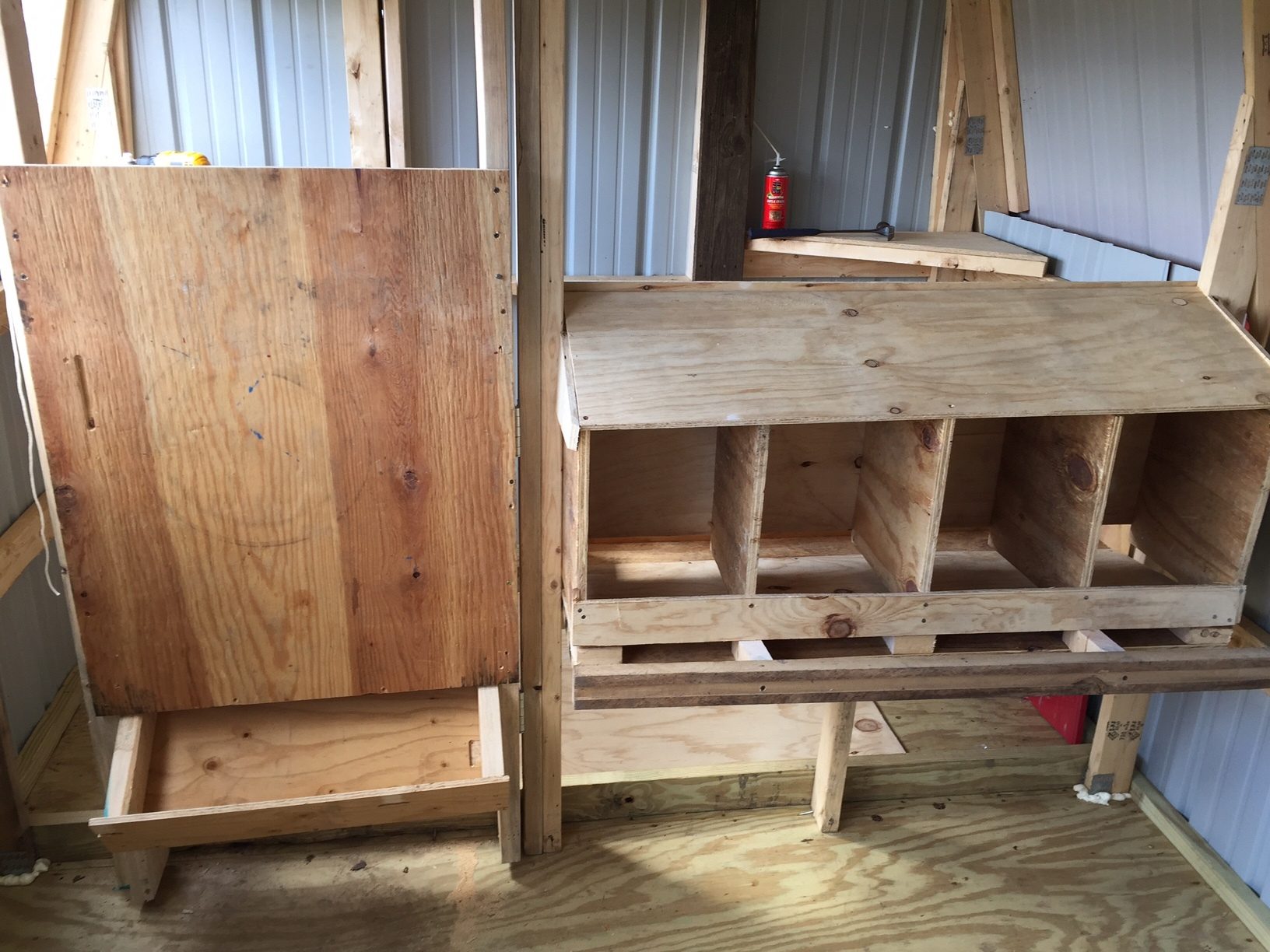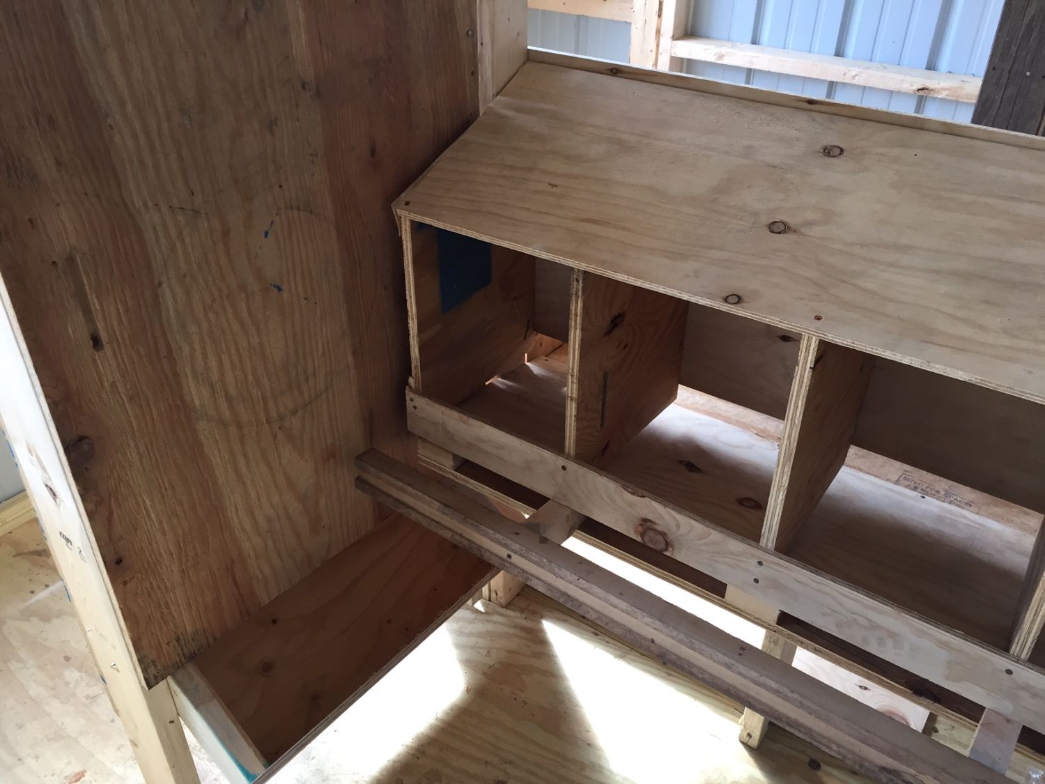 When the door is open, the bunk swings under the nesting boxes which overhang onto the floor space of the coop. I built rollout boxes so the eggs can be collected from the human portion. I plan to sell and give away eggs, and while I don't mind a dirty egg, I wanted to try to keep them clean. They still need carpet installed. They measure 12wx15d and overhang about 15" into the coop.