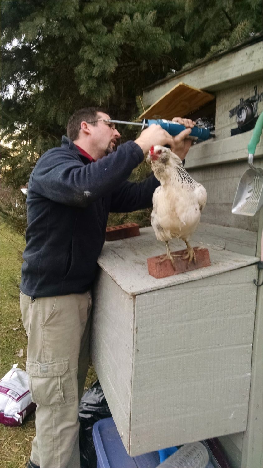 I see a couple of red flags here...the caulk gun was the first, you probably need more ventilation.I have a 4x4 coop with enclosed 8 x4 run. I have 3 Wyandottes and not sure of one pictured. I cut out a window today and the circular thing next to it is a solar light that is not needed. I want to put a small round vent there instead of the solar light. The window is pexiglass so it does not open. I should have made it so it could be opened. My chicken roosted outsde all summer because it was too hot in the coop I am sure. Rather than tearing off plexi glass. Could the chickens roost outside in summer and in for the winter. I plan on closing wood door to keep inside coop cooler in summer. I want to have 8 chickens by winter 4 on each roost but in summer I think they would want to rooast outside. This is the South side of coop. They seemed to do well with our cld MI winter. I had a heater. I am concerned about venting especially if I put 8 in the winter. I will need advise on venting properly. I wrapped coop in tarp and pop door was open all winter. Next winter I want to put clear plastic strips (pet door) on.