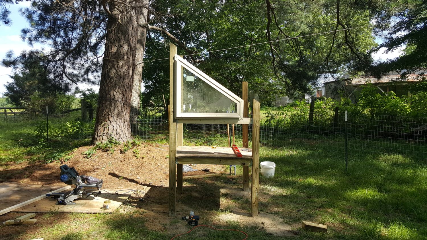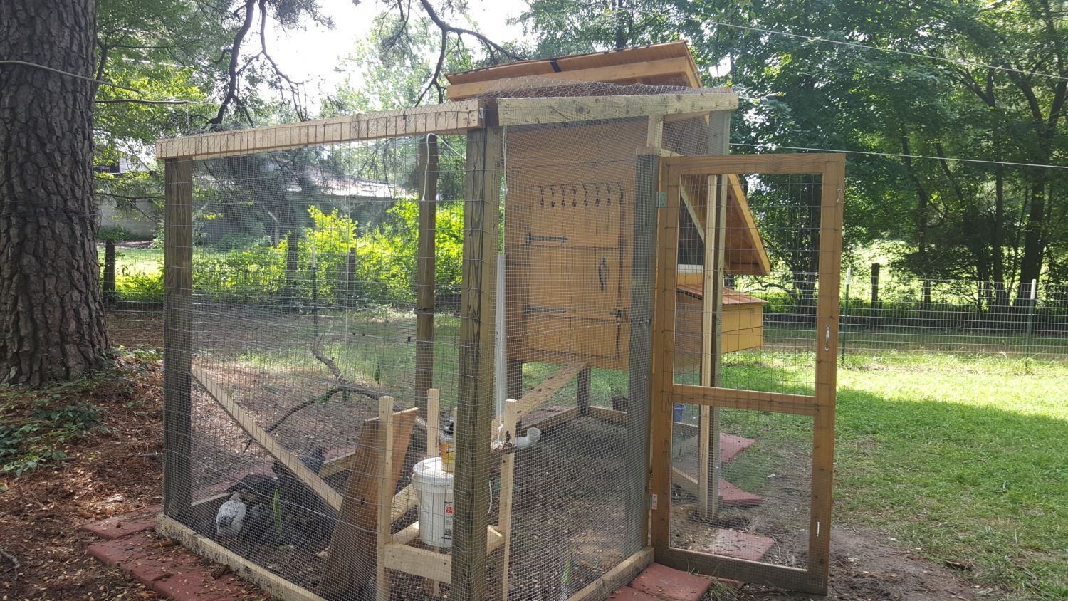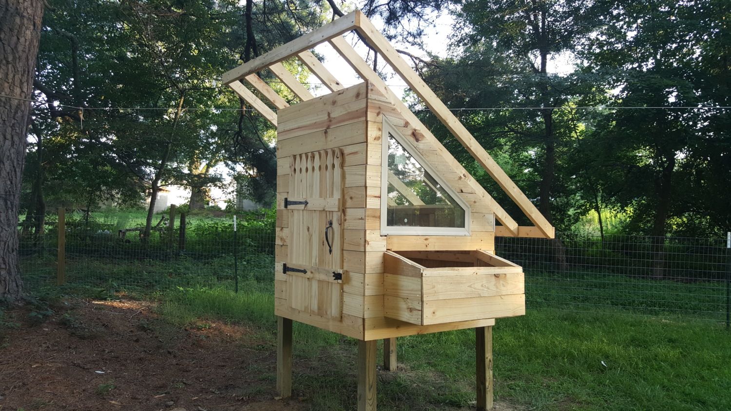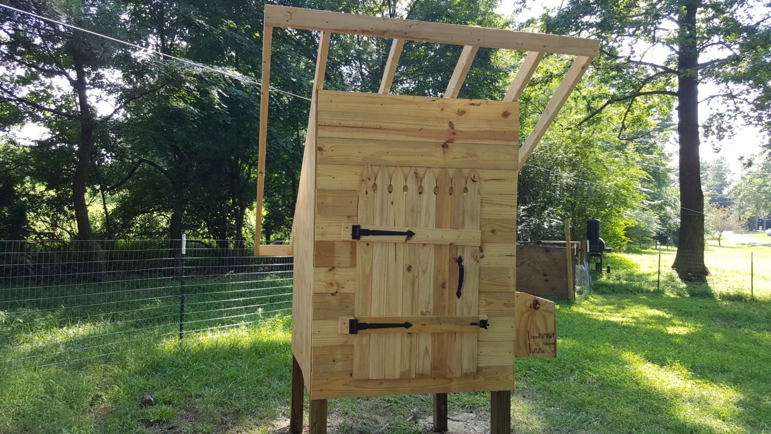 All in all it has been up one year, and has handled all four seasons fairly well. There is a lot of head-space in the winter and we had the first signs of frostbite at one point this year. Granted it was single digits for a couple days. We add a landscape flood light on the side without a window on real cold nights now. That is the side with the roost and no window, so it heats without shining on the birds all night. We also have a couple mini goats now and added a creep gate to keep them from eating chicken grain.