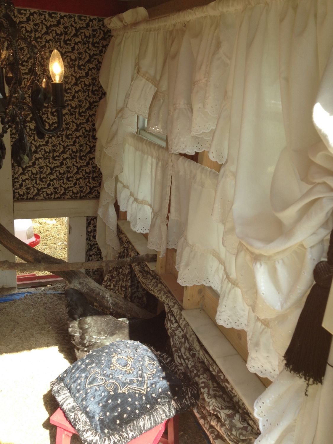 The chandelier looks like it hangs lower -than it really does . . .but, no the chickens have not tried to roost on it at all. Now the dust issue -yes the chickens are dusty,(as are all birds) LOL -So, since our flock is small -we commit to cleaning the coop as part of keeping them -usually weekly. We use apple cider vinegar to clean the walls weekly also (it breaks the chicken poo down really fast and leaves the Coop smelling fresh). We use a feather duster to clean the chandelier and everything else(besides the walls). The curtains are washed -usually every two weeks or so -along with the dog blankets, LOL(so, we wouldve been using that water anyway) Takes about 30 minutes a week -and is kindof relaxing actually . . . .