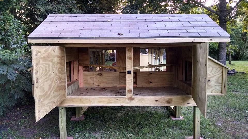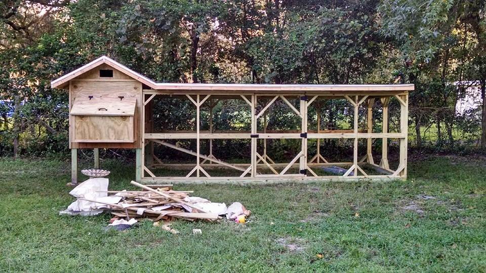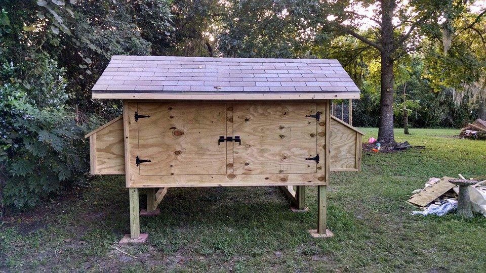 BTW, I cannot take credit for building this coop. A very nice man, carpenter by trade, built it for me and he did an awesome job. It only took him 2 & 1/2 days. I chose not to install actual windows, located in FL, and they were so expensive anyway. The windows will have 't bars' added to look like windows along with hardware cloth and screening and will have removable vinyl covers for the colder months here in FL (Yes, we get cold weather) and they will keep drafts from entering the lower level of the coop. The coop is designed to also have 1 X 2 vertical strips added for outside trim but I wanted to primer/paint before adding them. I also chose to add the shingled roof run area (vs a wire covered roof) and have it sloped towards the back of the coop away from the front door. This coop will be hopefully absolutely and positively predator proof when I am finished with it.