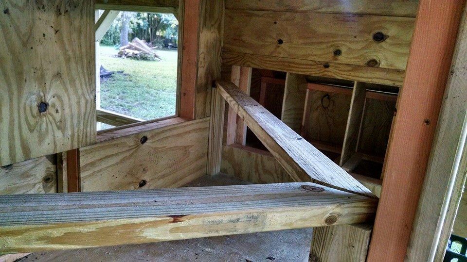 I have a "Daisy Coop", from purchased plans, with a 12 ft run and I am about to apply primer using a sprayer and then paint the coop the colors I have chosen. I plan on using linoleum on the treated plywood floor of the coop for ease of cleaning. The coop design had removable roosting boxes that I chose not to build and add to the coop floor. The 2 boxes do not cover the entire floor area and I would still need to clean around the outside edges and of course, the girls will be perching on the edges and pooping on the edges of the boxes anyway onto the floor. I added the diagonal 2 X 4s for roosting.
