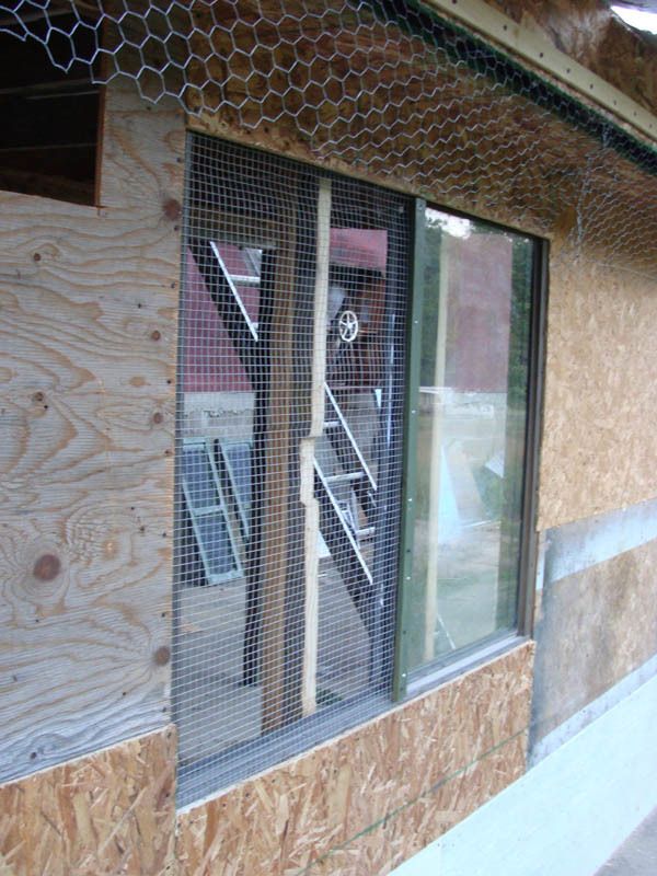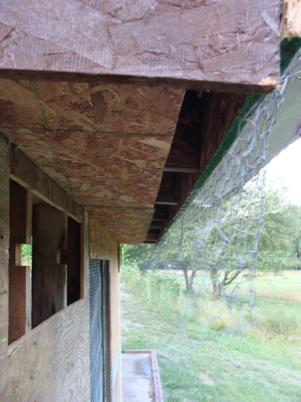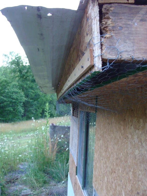 (BELOW) The oblong opening is going to be covered with a plastic "storm shutter" wrapped in standard wire, and held together with battens. This is one of two such vents.