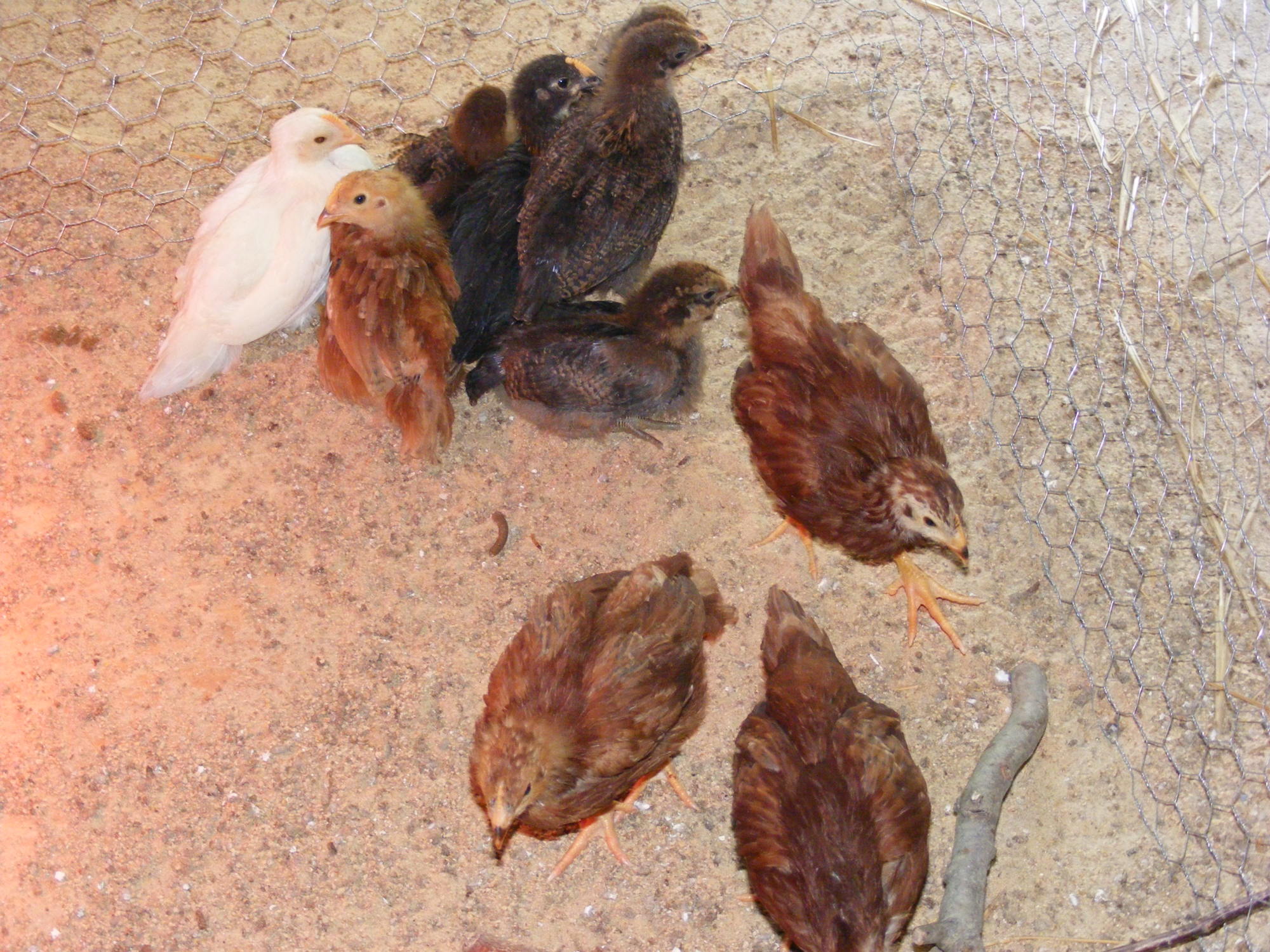 Oh & I can't forget our first chicks I sectioned off with chicken wire and a piece of plywood (put the plywood down for easy cleaning) a 4X4 in the corner of the coup. Our first batch consisted of 4 EE, 4 Red Sex Links, 1 Black Sex Link & 1 White Leghorn.