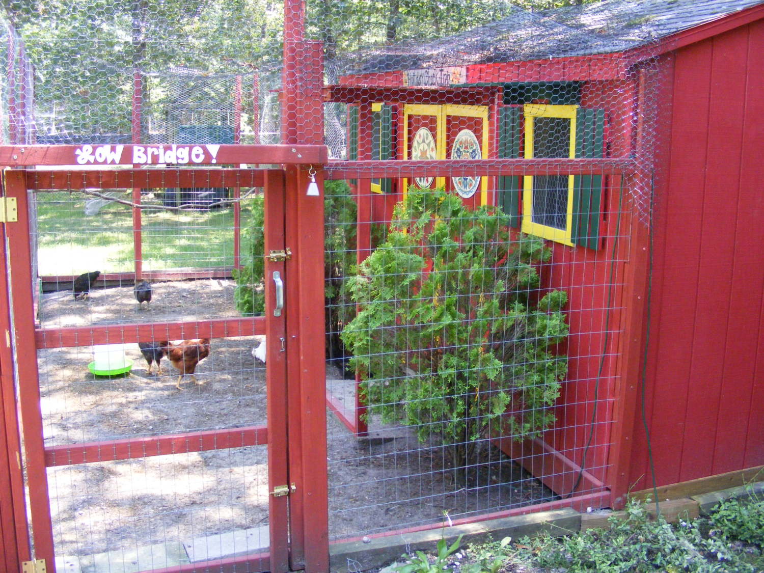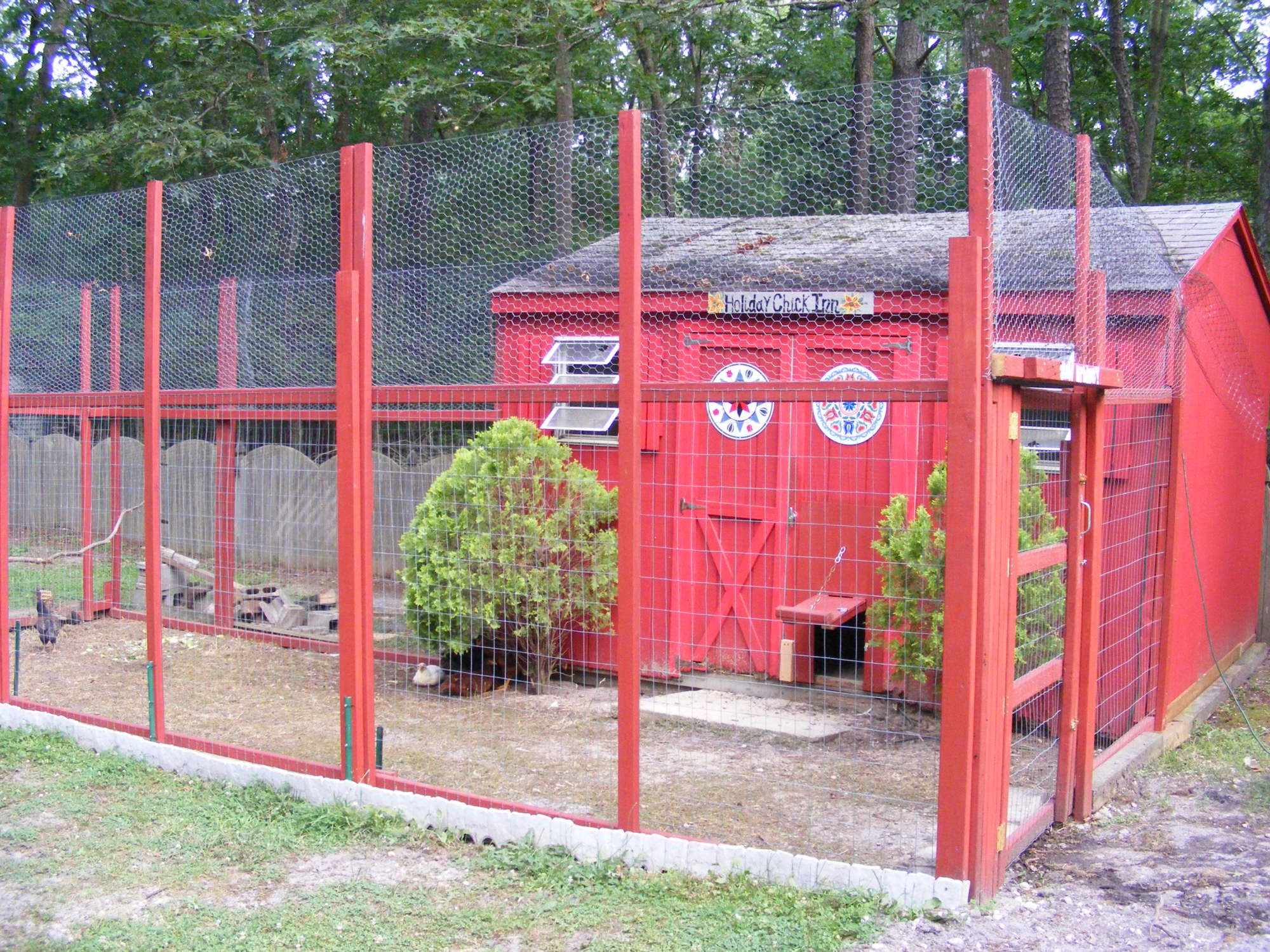 I used heavy gauge wire for the bottom 4 ft. of the run & poultry wire for the top. I also used some old plastic netting to cover the top. We have hawks around here. I wanted to replace the existing front windows. My 13 year old son a few years back shot holes in them with his bb gun. I guess boys will be boys.