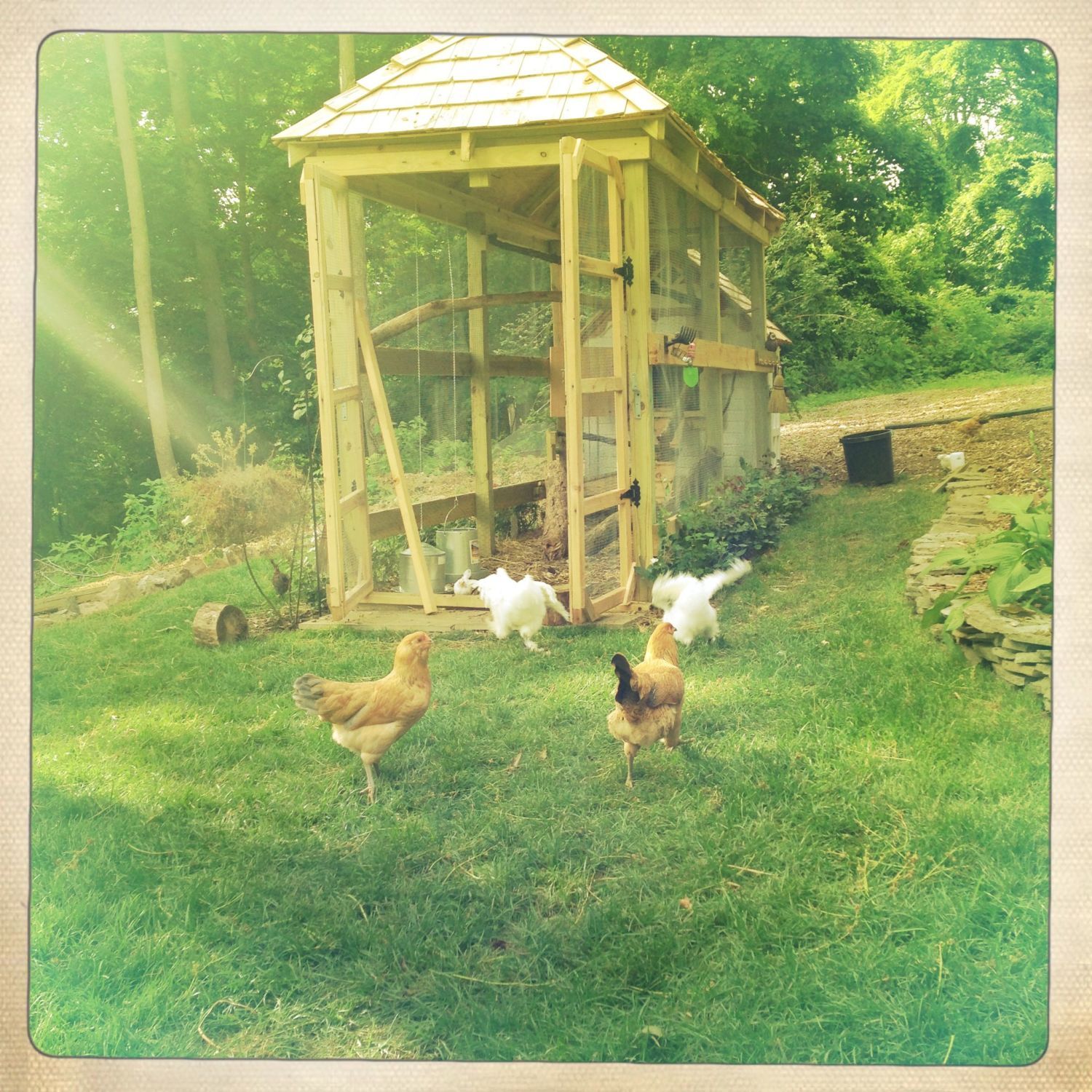 We just built an 8w x14d x 7h open-air style coop. We only have six chickens now, but I expected I'd want more in the spring. We still have to build an official roost (they just have an old tree branch which is too narrow for winter). And I need to paint, but that's way down the priority list. This first picture is about 3/4 of the way done.