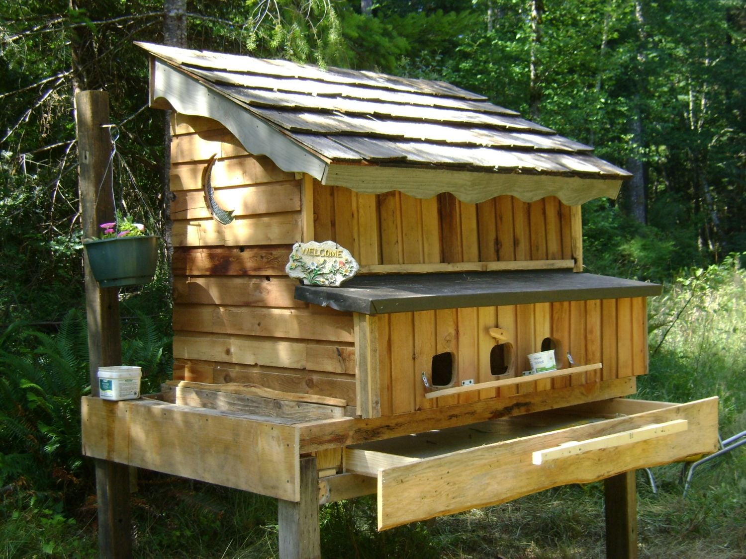 This is my first attempt. I am 69 years old and want my grandkids to experience what I did when my grampa had chickens. The drawer acts as the floor and has a plug in it to save shoveling the poop and shavings out. There will be a compost on the far end with a catwalk over it going into into a 10 by 10 fenced run. Hopefully the local eagles will be unable to snack on my little flock of four Bards. So far they love it and soon will get some fresh eggs. The nesting boxes are available at my grandaughters height. Might need more sunlight and ventalation. The overhang is screened for bugs and things bigger....comments please..PC